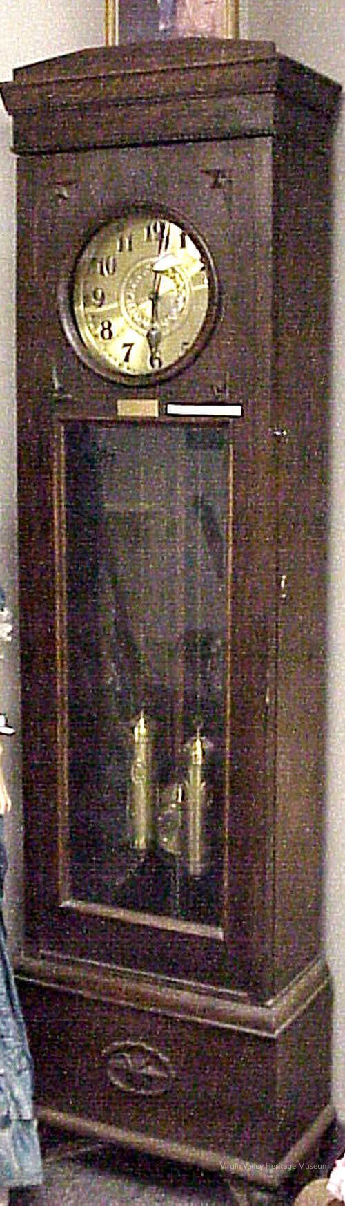 A grandfather clock manufactured in 1906. It was donated to the museum by Don Lee in memory of his wife, Lorena.