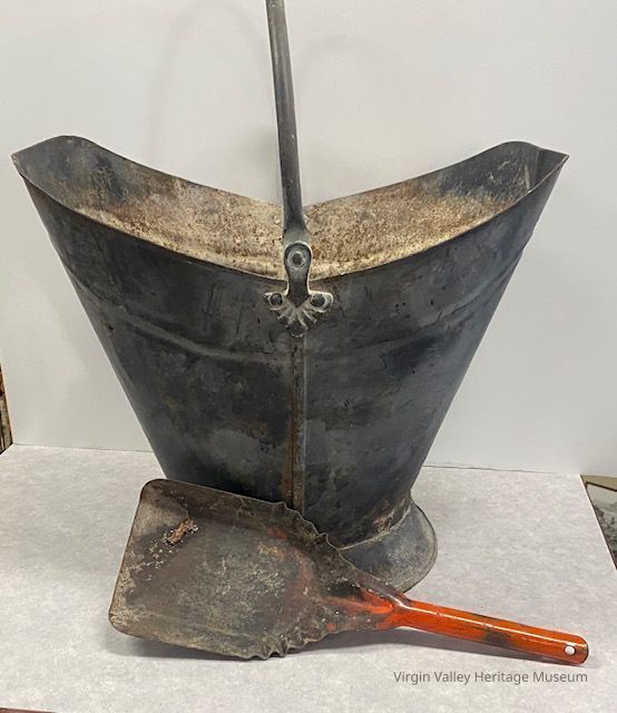 This image shows a worn metal coal bucket with a handle and a nearby coal shovel with an orange handle