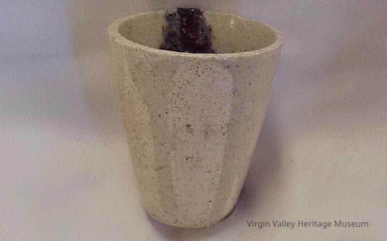 A crucible from Eddie Bounsall's mine in Gold Butte. Crucibles such as this were used to melt and separate precious metals from ore. They could also be used to determine the quality of minerals or ore.