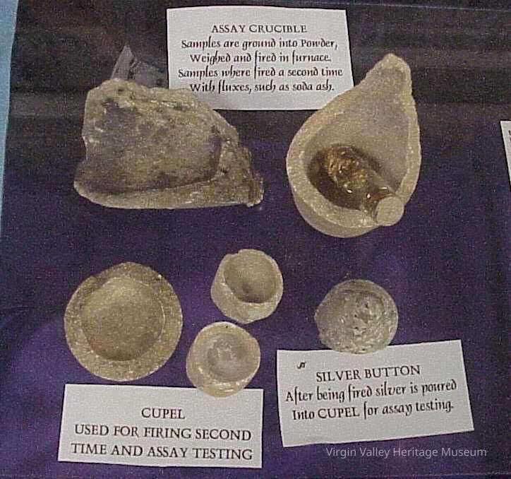 Crucibles and a Silver button from Assaying. A bottle with gold in it.