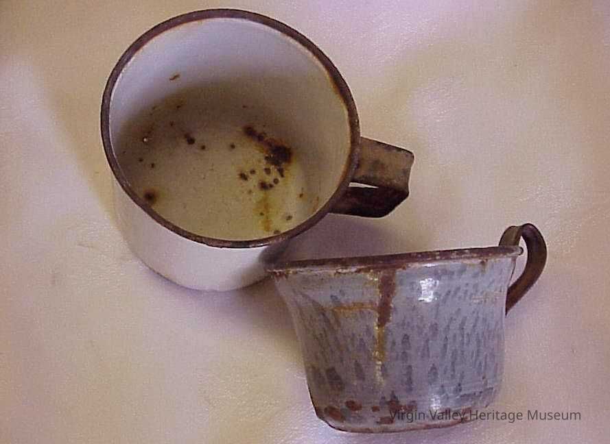 Enamel drinking cups that were clearly well-loved and used often.