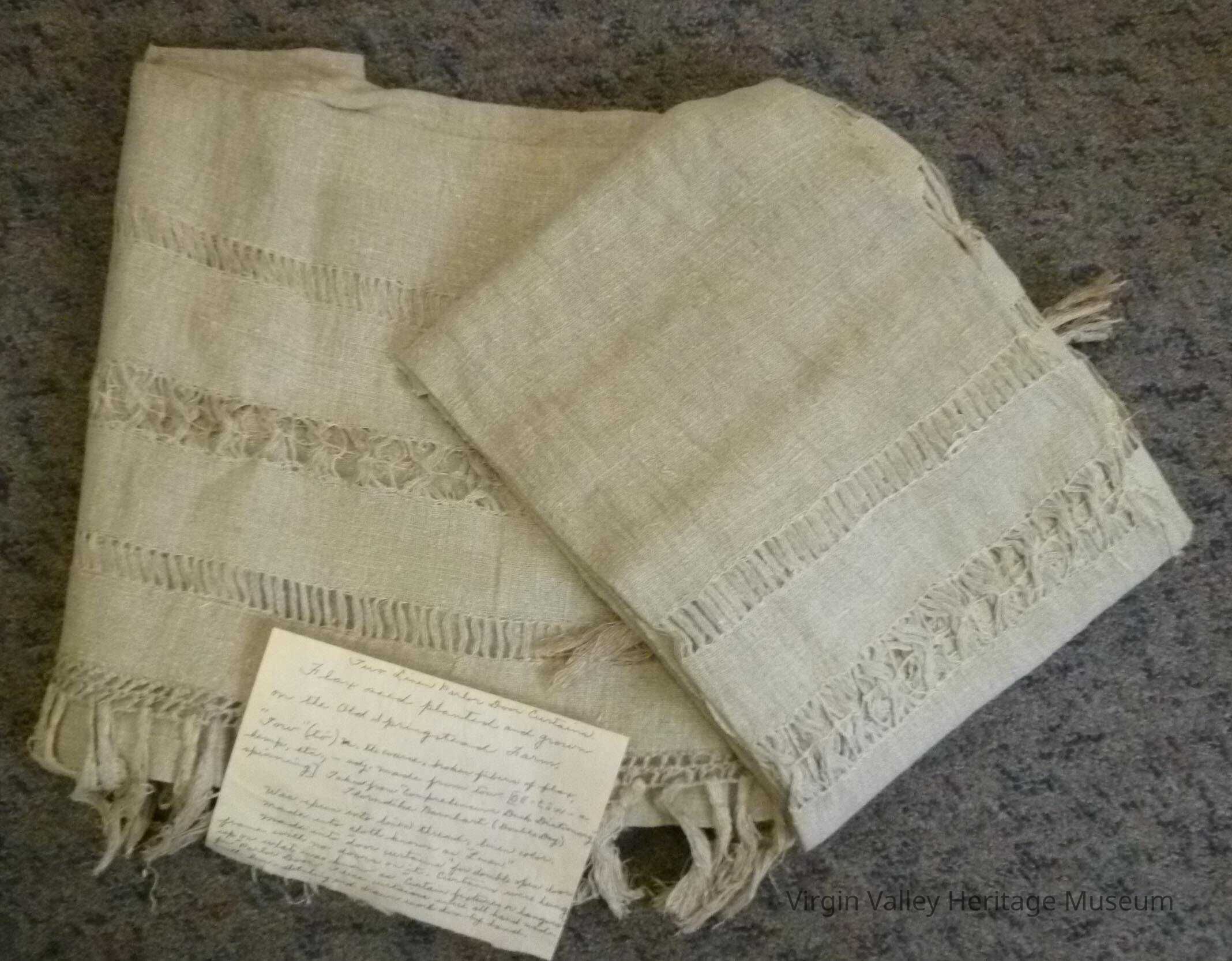 Was spun into linin thread, linin color. Made into cloth known as "Linin". Made into "Door Curtains" for double open door frame with no doors on it. Curtains were hung up on what was known as "Curtain fixtures or hangers" for parlor doors. These curtains were all hand made with hem stiching and drawn work done by hand.