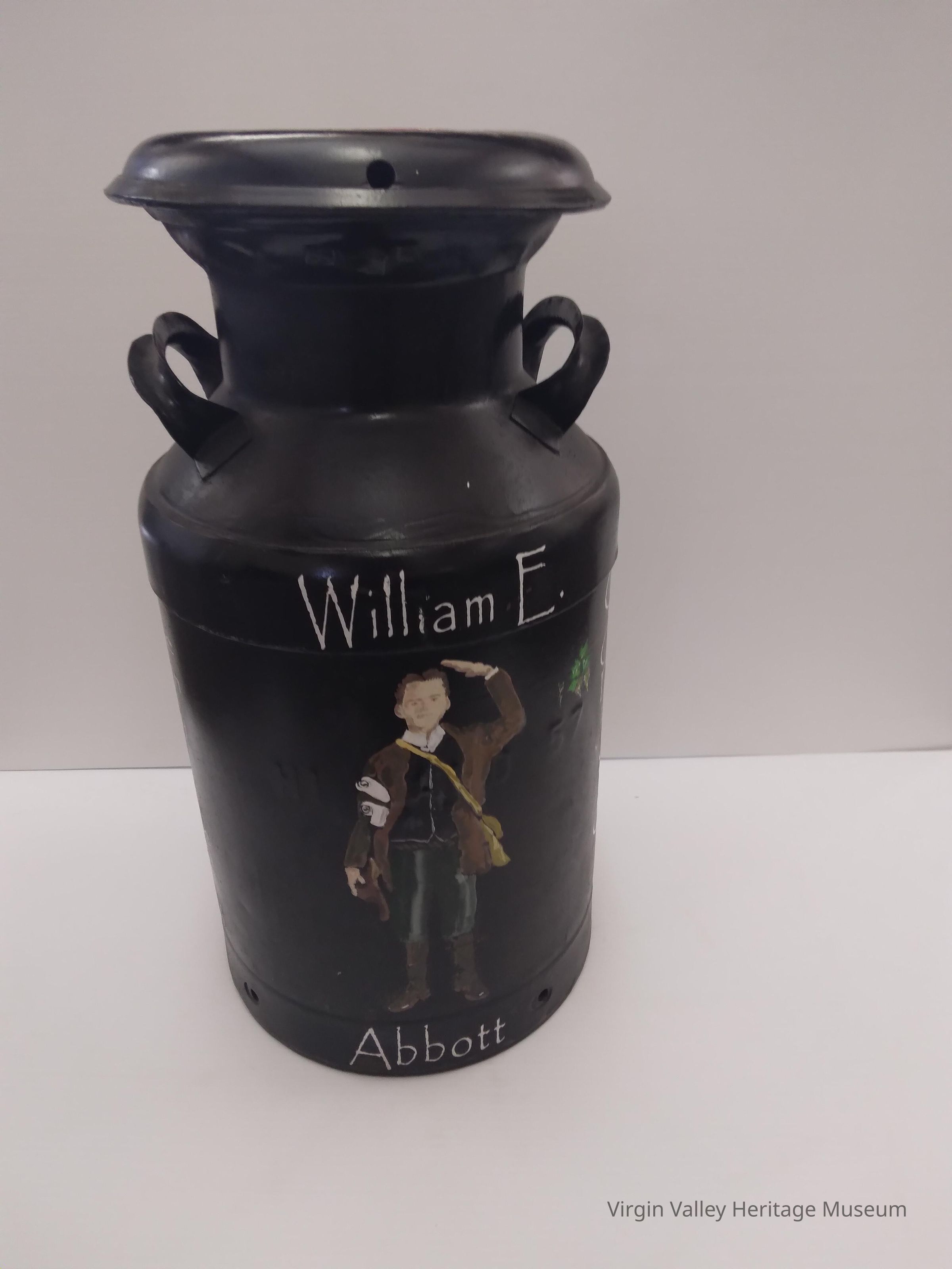 The milk can was sandblasted by D. Thurston's son and then painted black it was then given to Dian Frehner to paint a commemorative picture of William E. Abbott and Mary Jane Leavitt Abbott for the unveiling of the Pioneer Statue by the city. Dian painted several cans and theses were given to family and dignitaries