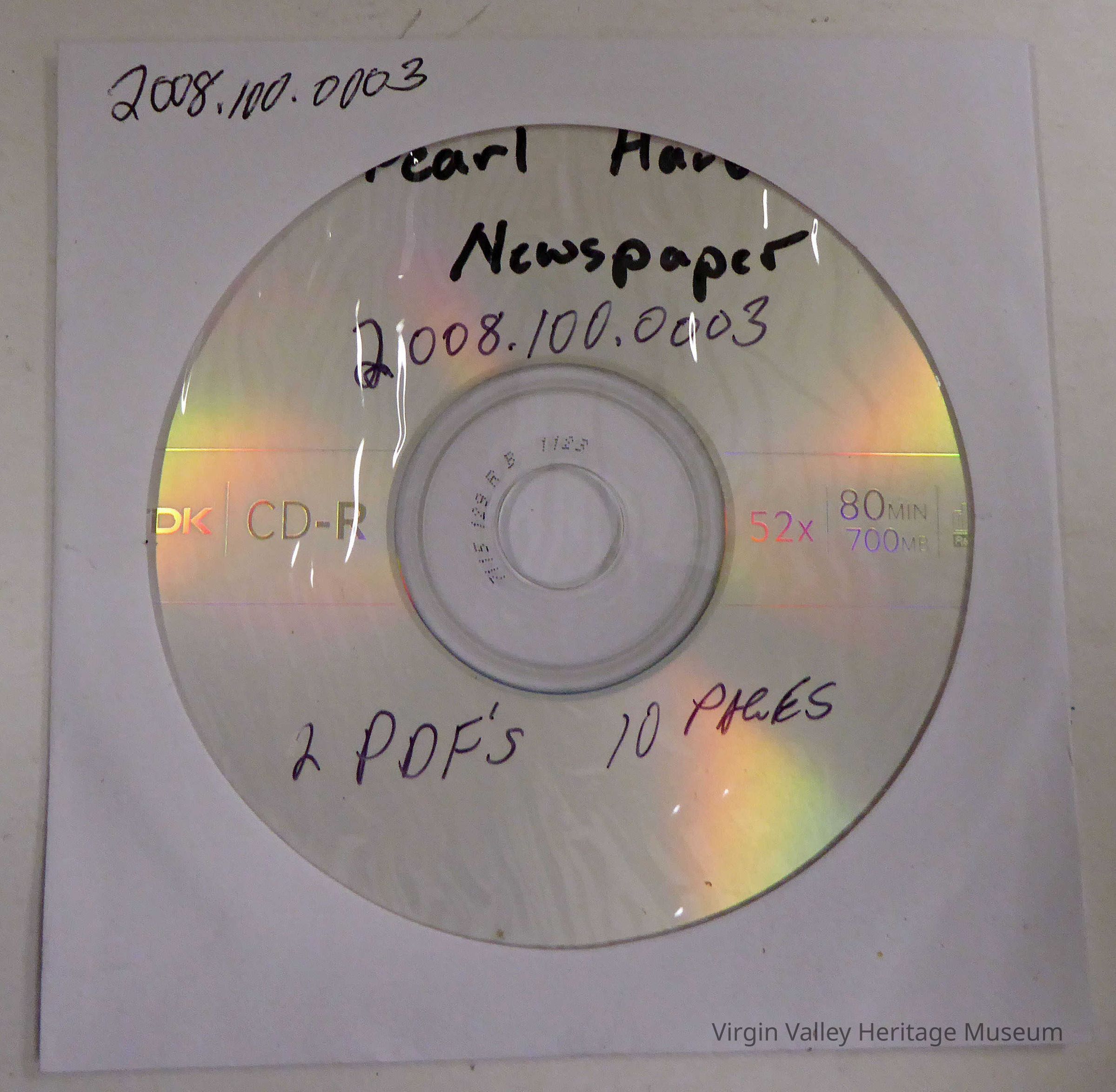 CD of a Newspaper from Hawaii. headlines of Pearl Harbor attack. PDF form 10 pages