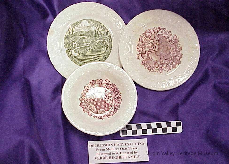 Two bread and butter plates and cereal bowl purchased using coupons from Mother Oats cereal. Owned and donated by Wesley and Verde Hughes Family.