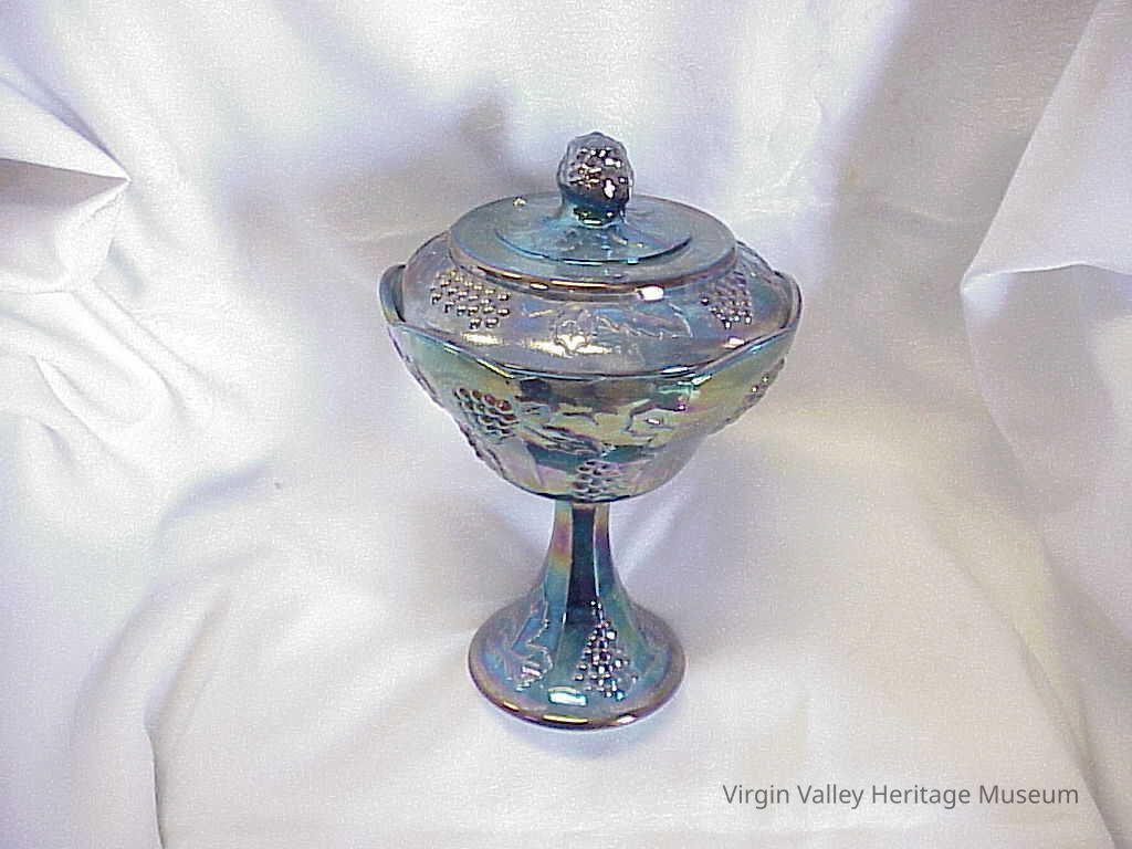Carnival glass gets its iridescent sheen from the application of metallic salts while the glass is still hot from the pressing. A final firing of the glass brings out the iridescent properties of the salts, giving carnival glass the distinct shine it is known for.](https://d8e7jbdw4fu0e.cloudfront.net/2095/0c1b1ce0-30ec-11ea-879c-3d15e97ecb6a-vdRnBrx.lg@2x.jpg)