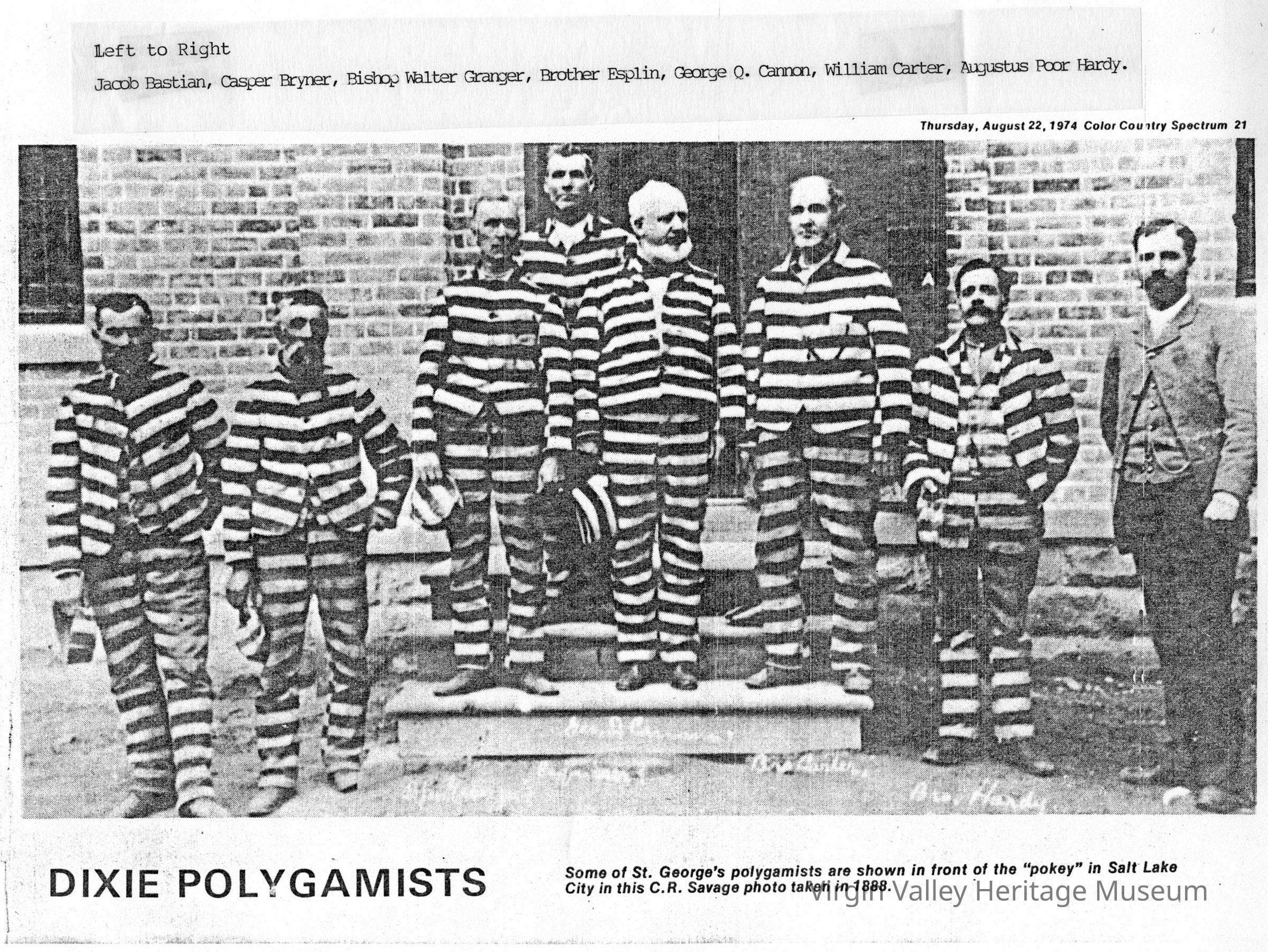 Left to Right - Jacob Bastian, Casper Bryner, Bishop Walter Granger, Brother Esplin, George Q. Cannon, William Carter, Agustus Poor Hardy The man in the suit was also a polygamist He was a gardener at the prison the prison officials did not him gardening outside in his prison suit so he was required to wear a suit His name was Herman Fredrick Ferdinand Thorup