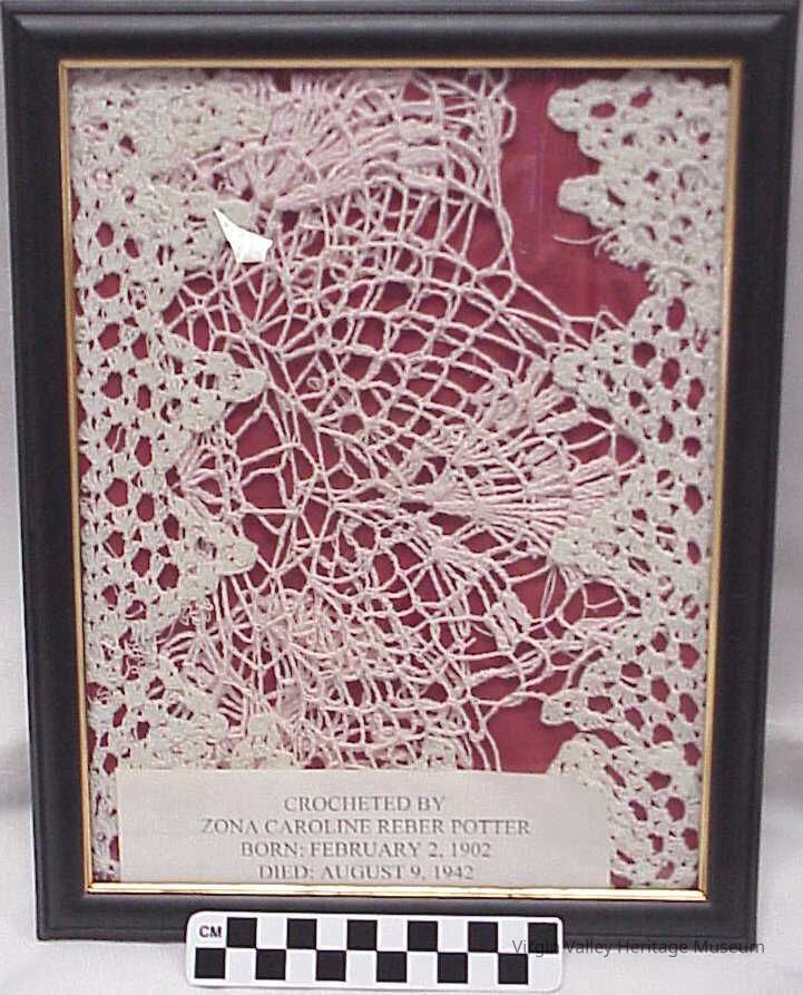 A doily crocheted by Zona Caroline Reber Potter, who was born in Littlefield, Arizona in 1902 and passed away on August 9, 1942 in Las Vegas, Nevada. Donated by her daughter, Hazel Warren.