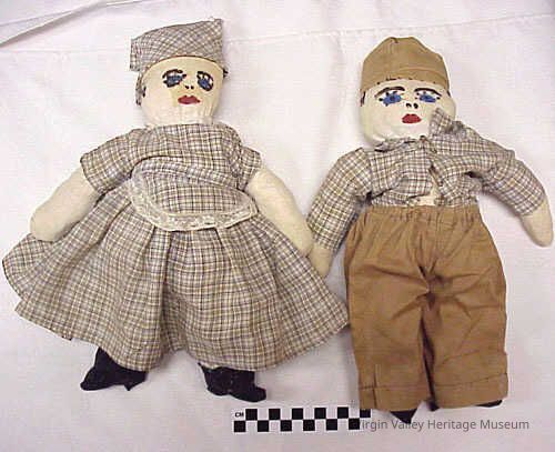 Handmade rag dolls. The dolls were made out of cotton and the faces were painted on; the clothes are handsewn.