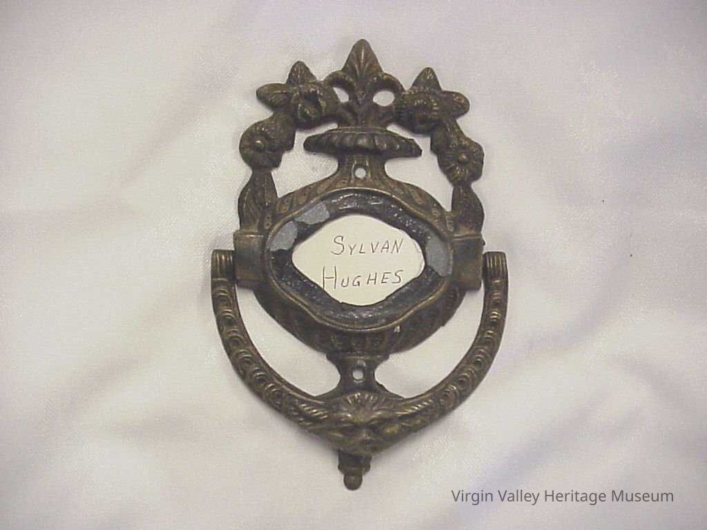 The door knocker from Zelda and Sylvan Hughes' home. The two were married on Nov. 16th, 1926. Sylvan liked to joke that the only reason Zelda married him was because he won a race against Glen Waite, another suitor of Zelda's. The couple lived an exciting life, winning a trip to Nassau in the 1960s and getting to see the dedication of the Hoover Dam by President Herbert Hoover in 1936.