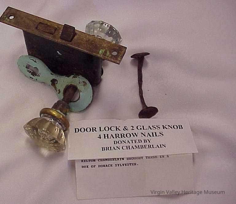 Door lock and two glass knobs with 4 harrow nails, only one nail is there Kelton Chamberlin brought these in a box of Horace Sylvester. Harrow Nail is in the Firehouse
