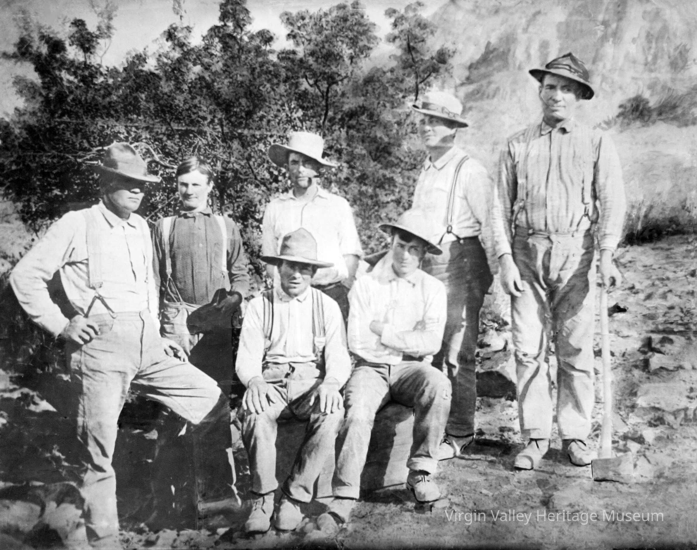 Photo of George Granger, Willis Guearo, Edward Cox, Wallice Woodbury, Mat Reese, William Abbott, James E. Hughes, working at Lead Mine on Bunkerville Mountain owned by Zilpha Hughes in the mountains southeast of the valley in 1916. Though it was a rich vein it turned out to be too costly to mine and haul out." Images of America Mesquite and the Virgin Valley" by Geraldine White Zarate
