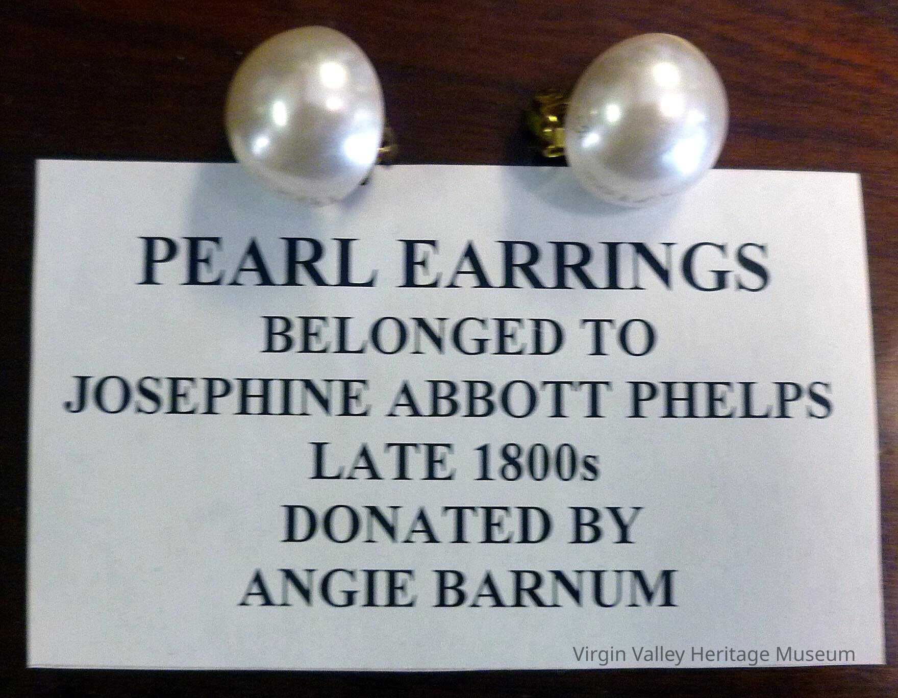 These pearl earrings belonged to Josephine Abbott Phelps and date to around the late 1800s. The earrings were donated by Angie Barnum.