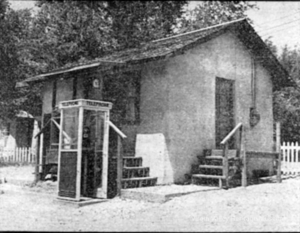 Hubert A. Leavitt, strung telephone wire wrapped around empty fruit bottles as insulators in the tops of Mesquite Trees and fence posts between Bunkerville and Mesquite in 1907 thus beginning the use of telephones in Virgin Valley. By 1908, telephone service was extended to Beaver Dam, Arizona Territory. A Board of Directors was formed and the stockholders of Rio Virgin Telephone Company met on July 17, 1908 and approved Articles of Incorporation. The company proposed to build and maintain a line from Moapa, Nevada to St. George, Utah. The life of this incorporation was to extend for 50 years. The leadership of this company changed over the years until it came under the control of J. Lewis Pulsipher and Mitchell Burns. Then, James and Rita Pulsipher bought the Rio Virgin Telephone Company from J. Lewis Pulsipher in 1944. They moved the telephone office from the Pulsiphers’ house at the Pulsipher Ranch to what had been the Egg House where they installed a new 40-line switchboard. Before that time the company serviced only four telephones. The sheriff had one; the store had one; a garage had one. Everyone else went to the telephone office in the Pulsipher home to make or receive calls. The building became the first freestanding telephone office in Mesquite
