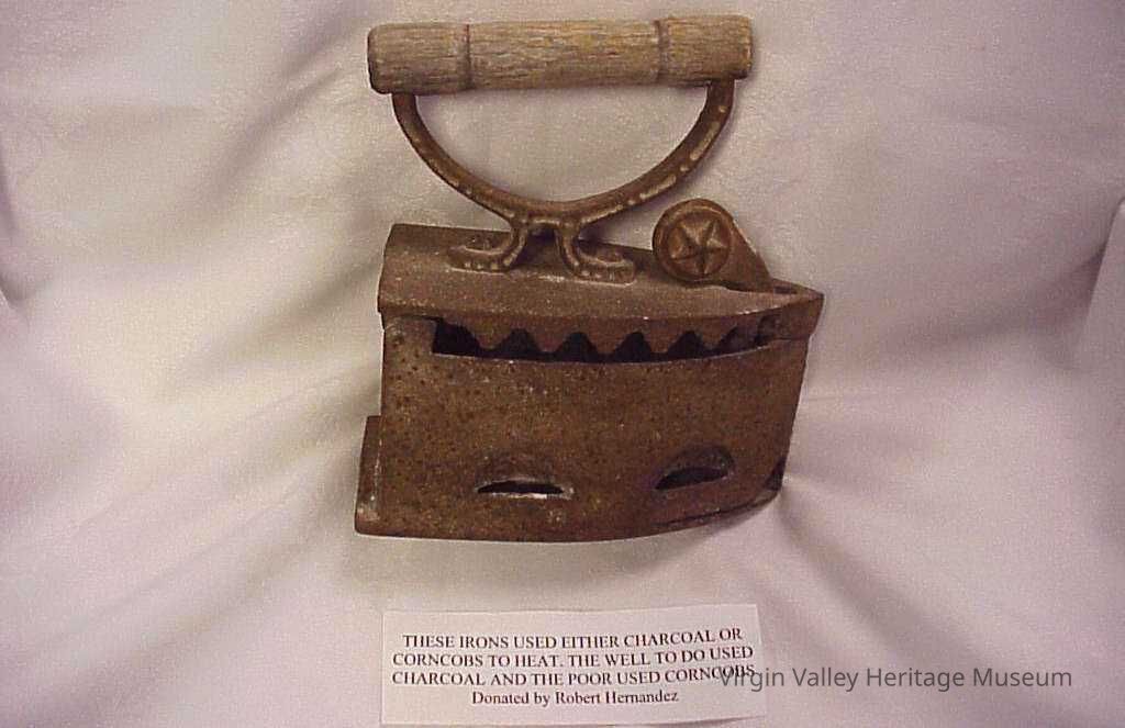 A flatiron donated by Robert Hernandez. Irons such as this were heated up using either corn cobs or charcoal. The wealthy used charcoal while the poor used corn cobs.