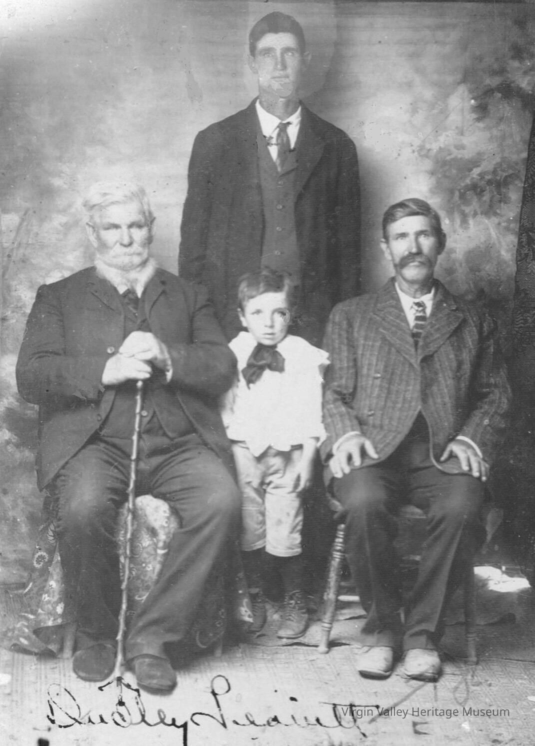 A photo of four generations of Dudley Leavitts. First, on the far left, is Dudley Leavitt, who was born in 1830 and was one of the original founders of Bunkerville. On the far right is his son, Dudley Leavitt Jr., who would have been about 21 when his family moved to help settle the Valley around 1877. Behind him is his son, Dudley Edgar Leavitt, who married Bertha Hafen. Finally, the small boy in the center of the photo is Reuben Dudley Leavitt, Edgar's son.