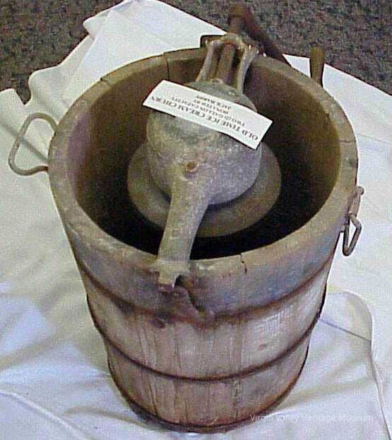 A two gallon ice cream freezer donated to the museum by Leo (Jack) Hardy. Once all the ingredients had been put into the bucket, one would turn the crank to freeze the concoction into ice cream.