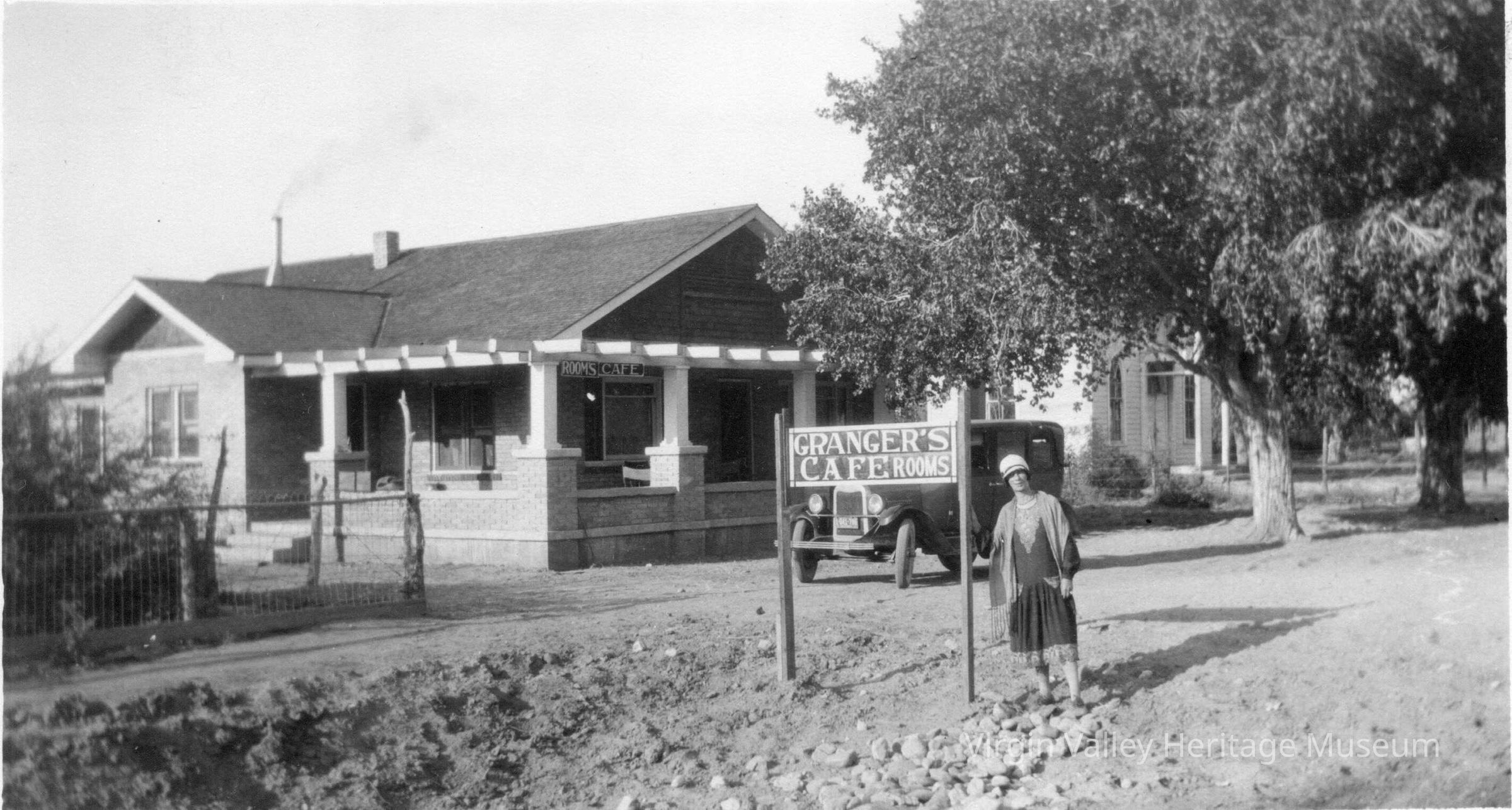 George & Clara Granger Home Myrtle Pulsipher standing by the sign Current location of original is unknown