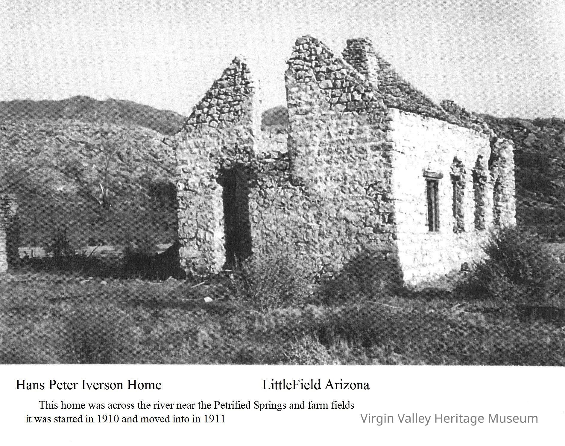The home of Hans Peter Iverson, one of the early settlers of the Littlefield area. Hans was born in Denmark on September 24, 1835, meaning he would have been 44 when the area was being settled around the 1870s. Hans was a member of the Church of Jesus Christ of Latter-Day Saints and had three wives and sixteen children. When this house was being built in 1910, he would have been 75 years old. The house was supposedly moved in 1911, but it is unclear where the house was moved to, or if it was ever finished, as Hans would die about ten years later in 1921, at the age of 86.