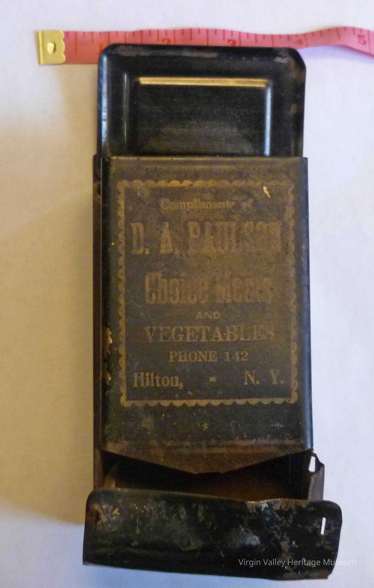 A wooden kitchen match holder. It is from D. A. Paulson's Choice Meats and Vegetables, a popular store in Hilton, N.Y. in the early 1900s.