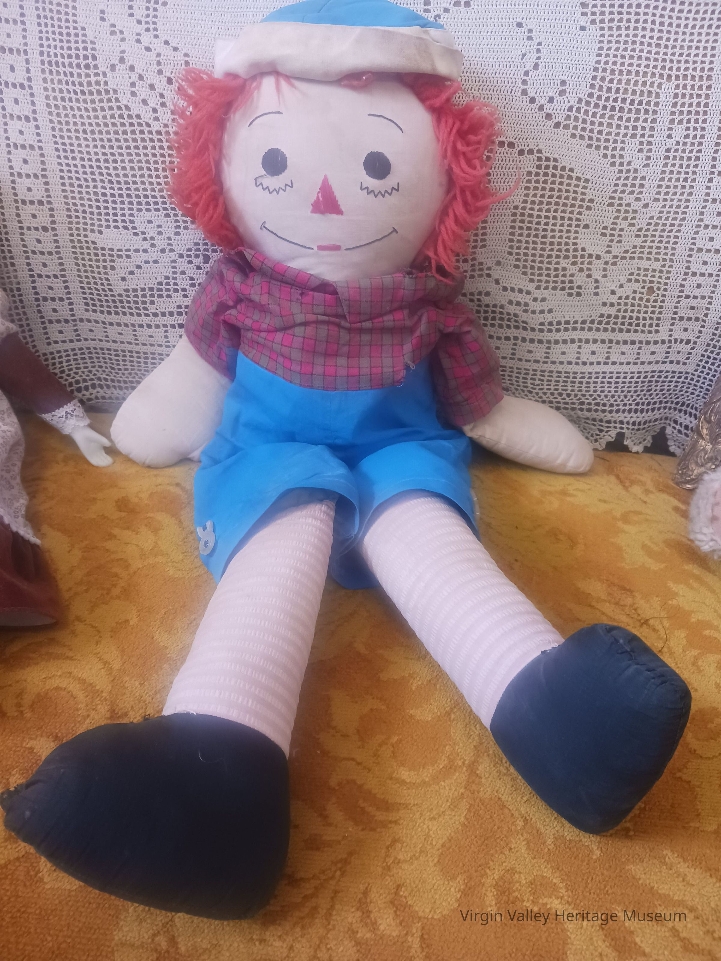 A Raggedy Ann doll sits on a patterned carpet, wearing a blue outfit and striped stockings.