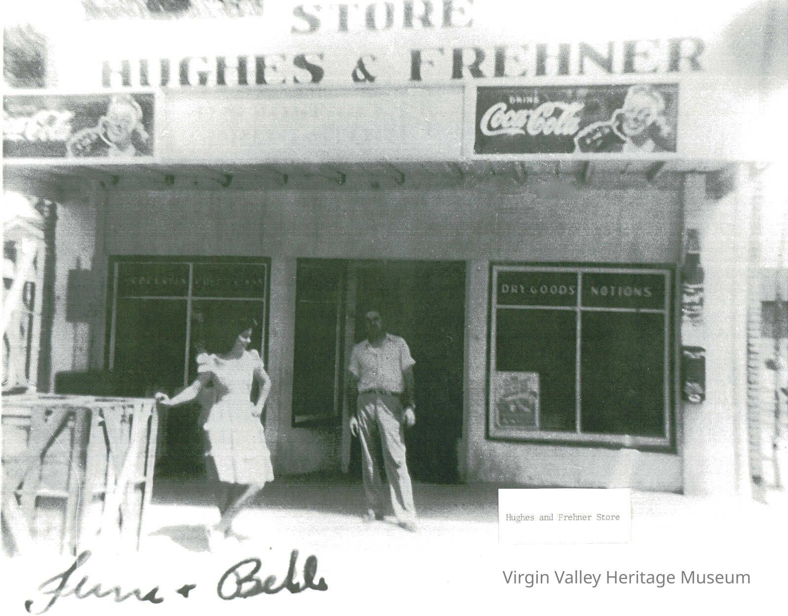 When the bridge to Bunkerville was built across the Virgin River in 1921, the main route came up Main Street (now Mesquite Blvd.). Before that, traffic between Bunkerville and Mesquite followed the river to the then Woodbury Lane crossing then on up what is now Willow Street. Because of this change in the traffic flow, the J.E. Hughes and Sons General Merchandise store was moved to this location on Main Street. Alfred Frehner was now a co-owner. The modern Hughes and Frehner Store was built of adobe brick (16 inch thick walls). In 1926, the post office was moved to the back of the store with Elmer Hughes as postmaster.