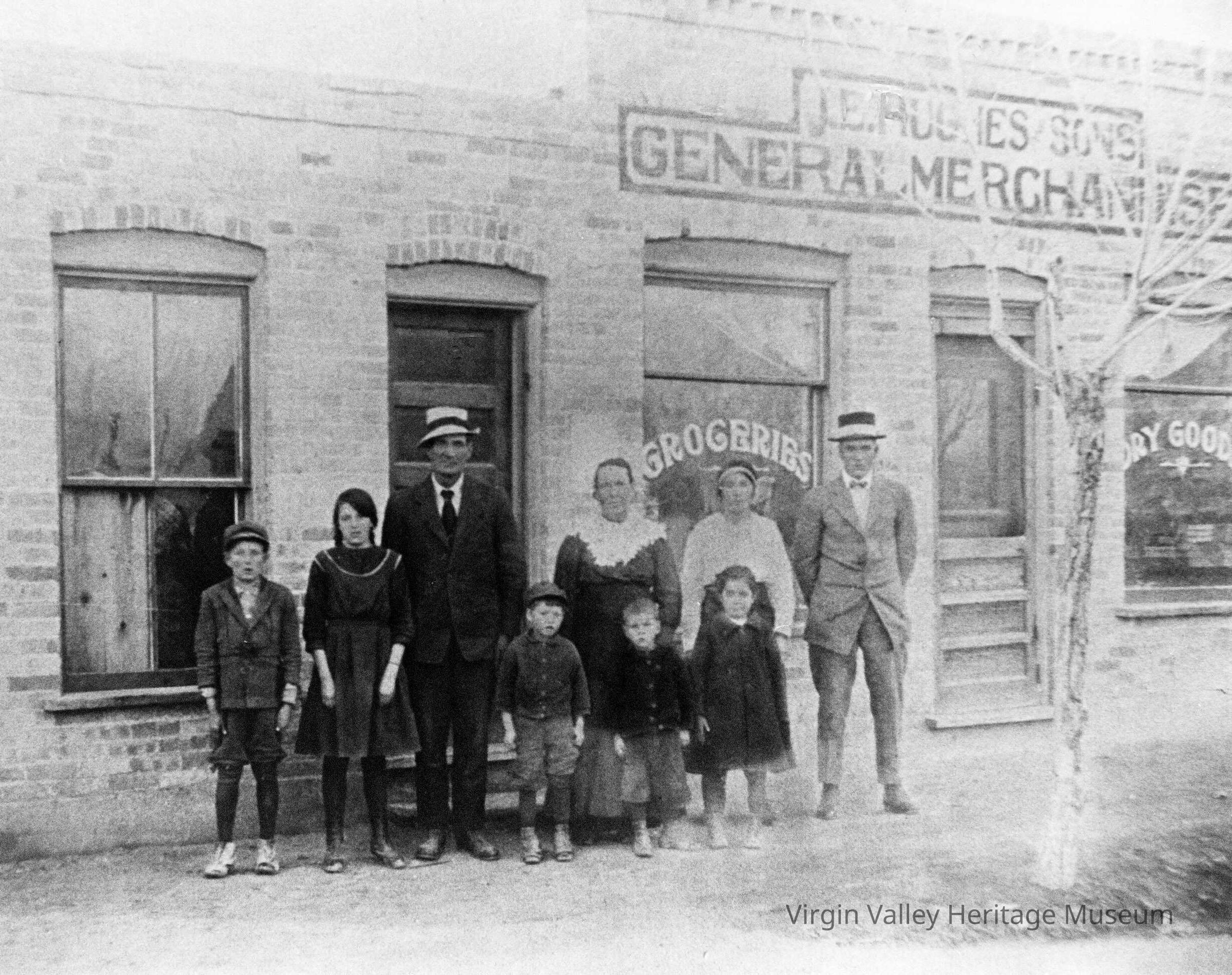 James Elmer owned the block between what is now Willow and Yucca streets and Mesquite Blvd. and First North. He built his lumber and adobe home on the northeast corner of the lot. It was a large home for the time, one of the nicest in town. It had five rooms and a large back porch. They made a small front room into a store where canned goods and such were sold. Later, it was also used as a small post office. The business grew and they were able to build a nice adobe brick store and post office adjacent to the house on the south side.