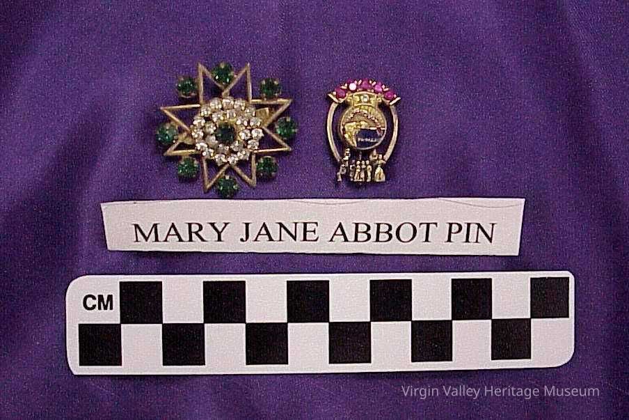 These pins were owned by Mary Jane Abbott. Mary Jane Abbott was known as "Mesquite's Angel of Mercy" due to her helpful and loving nature. A statue of her and her husband, William, stands outside City Hall as a monument to the character and strength of the early settlers of Mesquite. The eight-point dress pin was actually gifted by Mary to her niece, Eleanor. When Eleanor was sixteen, Mary noticed her admiring the pin and altruistically gave it to her on the spot. These pins were donated to the museum by Eleanor and Lewis Nielson.
