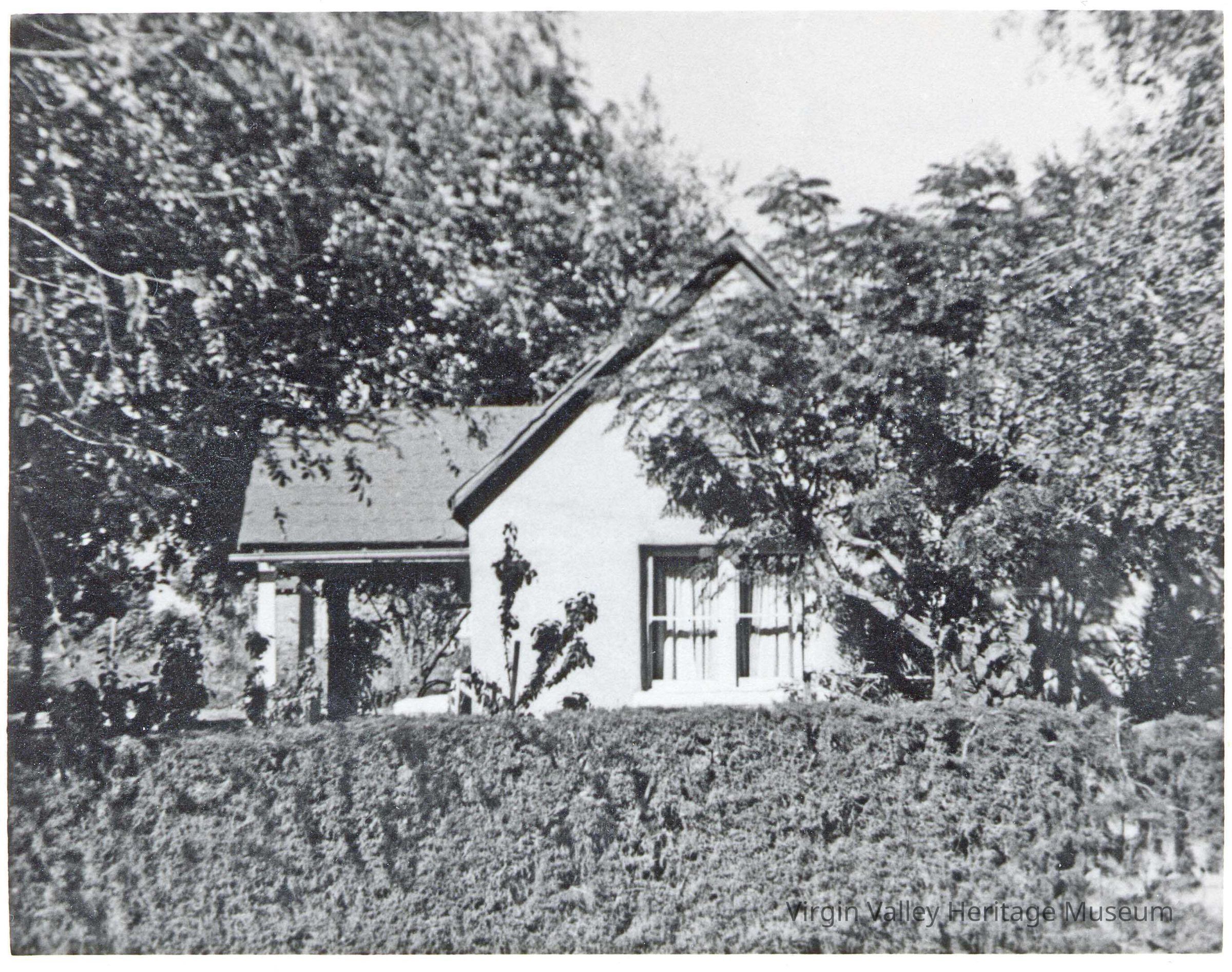 In 1901, trading labor at the adobe brick-making yard for 'dobies, enough bricks to build the permanent home were earned. The new home was a large room 14 x 16 feet with three 'dobies thick walls. Made from lumber hauled by John David from Mt. Trumbull in Arizona and covered with shingles hand made on the mountain, the roof was extended 10 feet on both sides of the room to form two full-length porches. The tent school was attached to the back of the house. Its walls were lined with boards and a board floor was installed. In the 1950's the house was sold. The new owner razed it and built a new home.