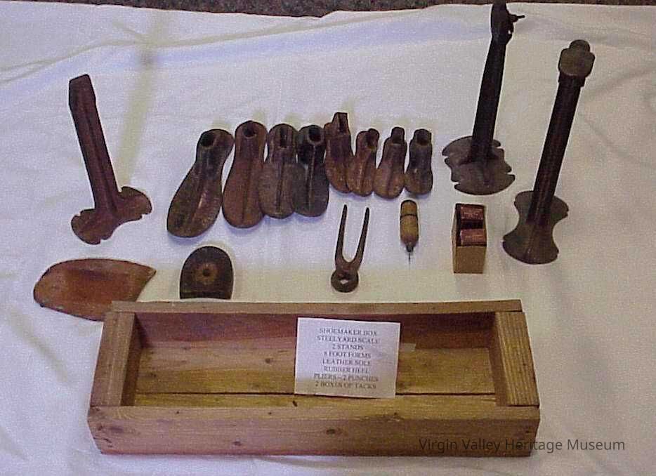 Shoemaker Box 2 Stands, leather sole, 8 foot forms, rubber heel, pliers, 2 punches, 2 boxes of tacks - From the Elizabeth and Merl Whittwer family