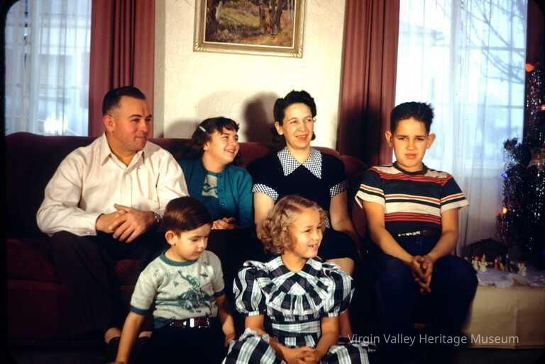 A photo of Leon and Minnie Frehner's family. Leon was the oldest child of Alfred and Dorothy Abbott Frehner. He married Minnie Checketts on June 21, 1938 and the two went on to have six children together: three boys and three girls. This photo was taken before their two youngest, Layne and Anita, were born.