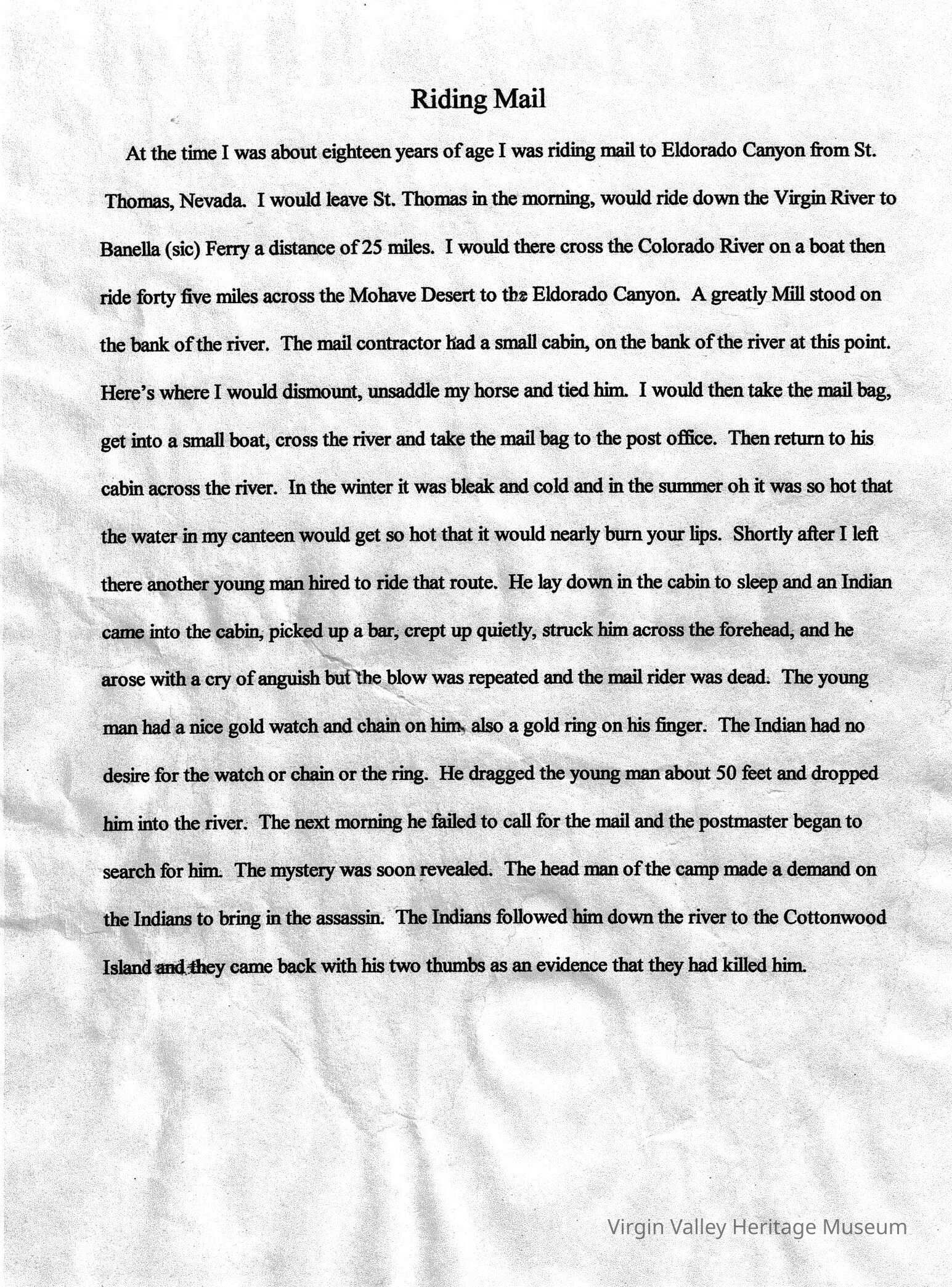 Letter written by William Abbott, when he had a mail route to Eldorado Canyon from St Thomas, at age of eighteen.