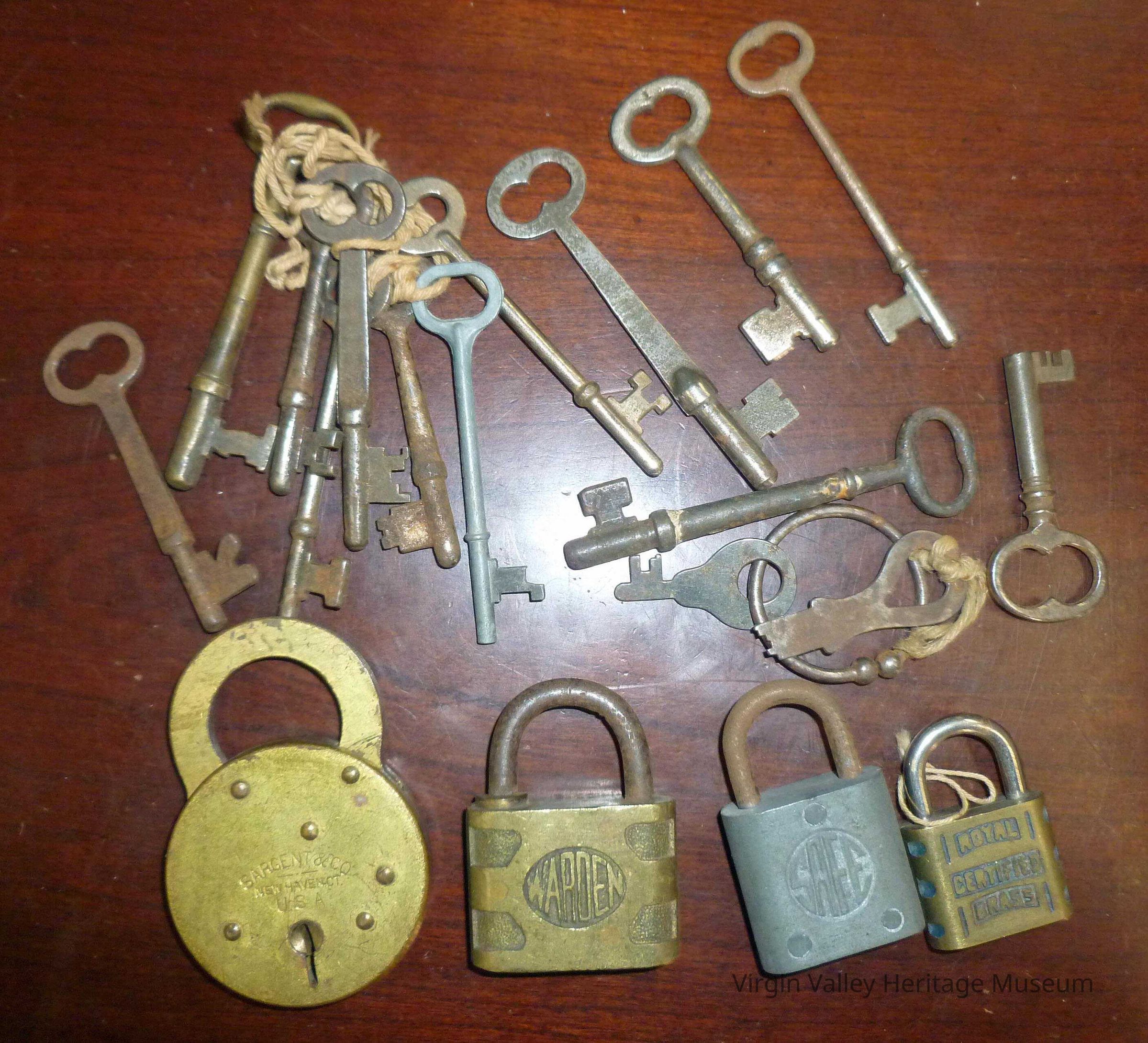 Four Locks and keys assorted skeleton , warded lock keys etc the locks do not have keys 1 Sargent & Co. lock, 1 Corbin / warden brass lock, 1 Royal certified brass lock, 1 SAFE lock