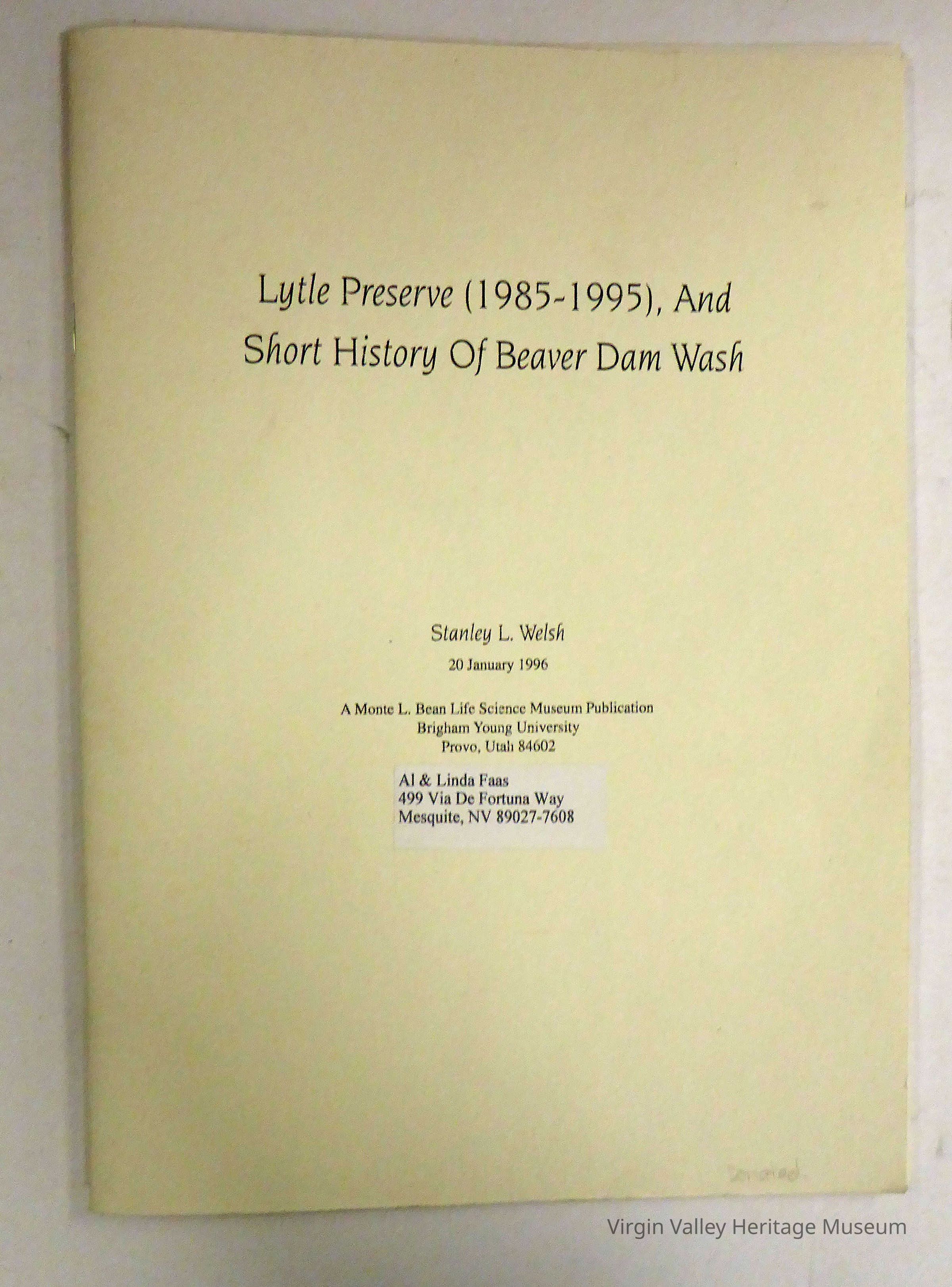 A soft cover book on the Lytle preserve (1985-1995) And a short history of the Beaver Dam Wash. Written by Stanley L. Welsh.