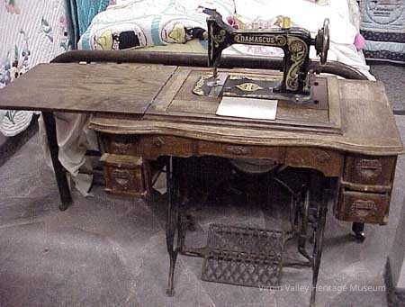 A Damascus Sewing Machine that was purchased by Edith Lovisa Knight Wittwer in 1905. Edith was the daughter of Santa Clara pioneers and later moved to Bunkerville with her husband, Harmon Wittwer. Edith made all of her and her five children's clothes on this machine. She sadly passed away at the young age of thirty-three due to some accidental burns.