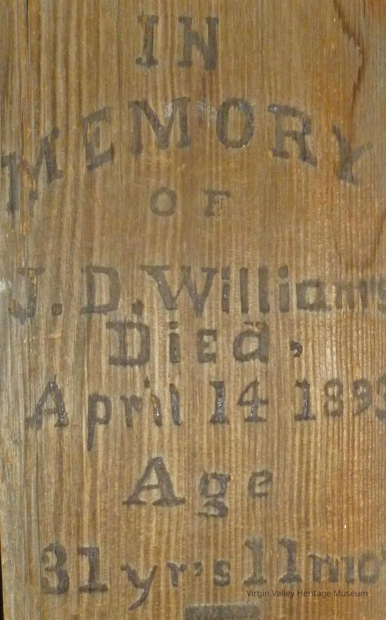 Grave Marker - Wooden Head board for a grave. Marked "IN MEMORY of J. D. Williams , Died, April 14 1893 Age 31 yrs 11 mo's"