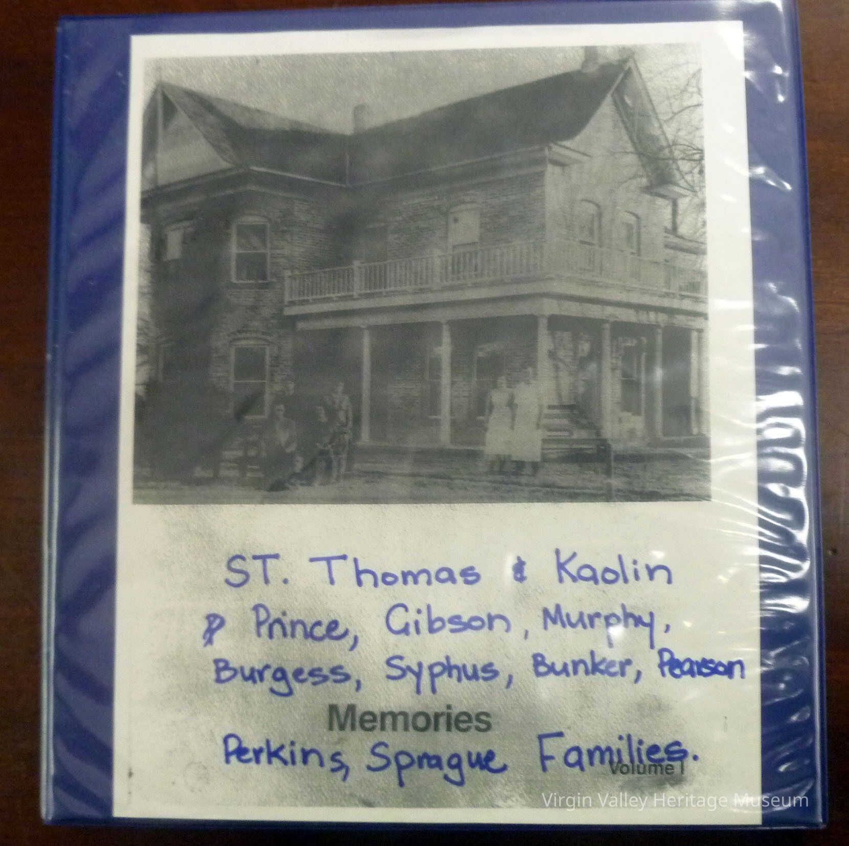 and families-Prince, Gibson,Murphy, Burgess, Syphus,Bunker, Pearson, Perkins, Sprague. Articles, photos and writings of the families who lived in St Thomas and their subsequent relocation due to building of the Hoover Dam.