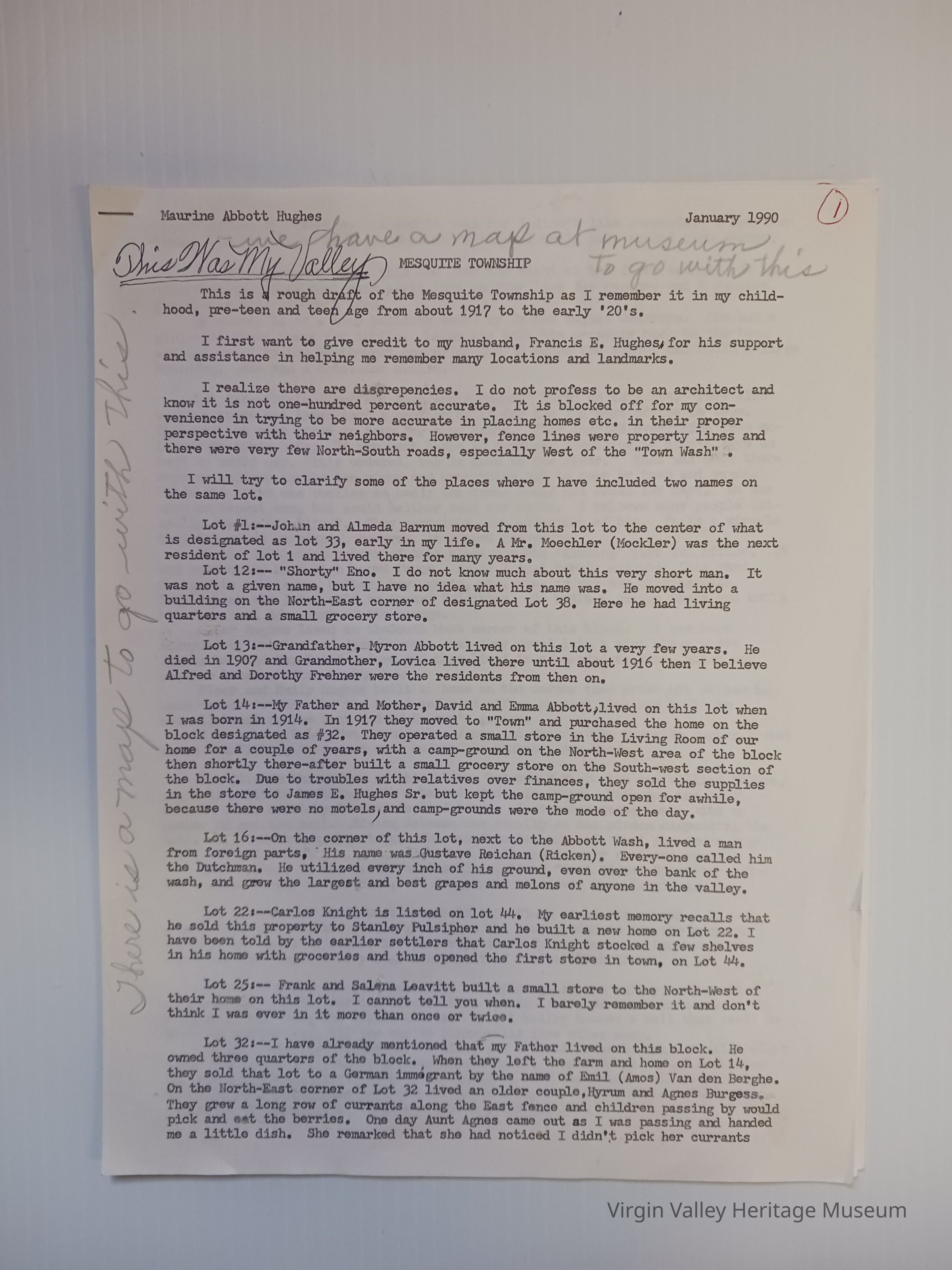 Maurine Abbott Hughes January 1990 Rough draft of Mesquite Township as she remembers it