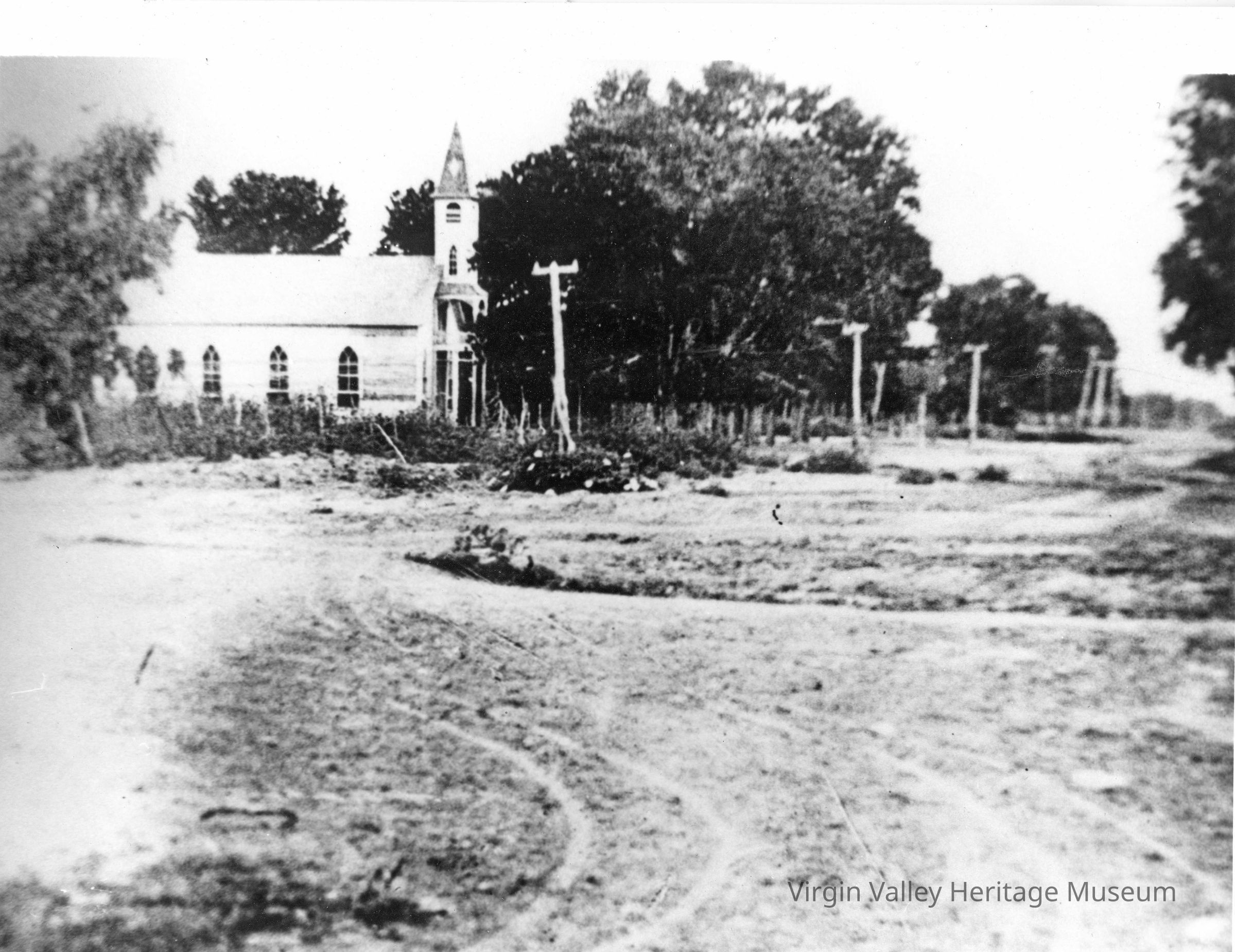 8 X 10 picture from the Ira Reber, of Mesquite's 2nd Chapel, erected in 1909 by the townspeople under the supervision of Bishop William E. Abbott. It had arched windows and a steeple with a bell that rang to summon the congregation at meeting times. Photo taken looking West in about 1915.