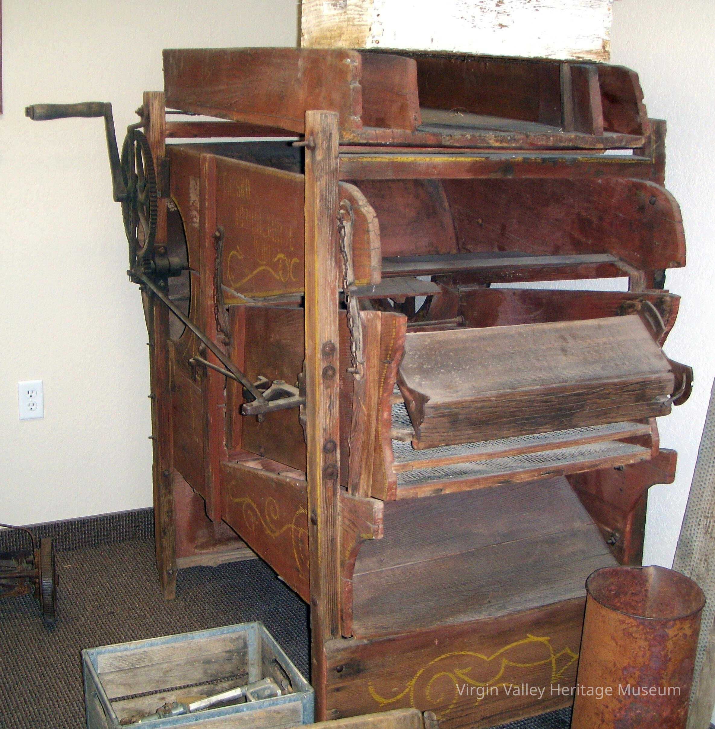 Fanning Mill - by Fresno Agricultural Works - The raisin grape machinery purchased in 1920 by Samuel Jr. and Mary Jane Reber was 25 years old at the time and had never been used. The machines were hand operated and were used to do custom work for others as well as their own use. The machinery not only removed the stems, leaves and other foreign material, but graded them into three sizes, Jumbo, regular, and Currant. Raisins were pressed into 25 lb wooden boxes for market. They were sold for cash and exchanged for own needs. To market Samuel Jr. traveled yearly to Cedar City, Utah with his load of boxed raisins by team and wagon.