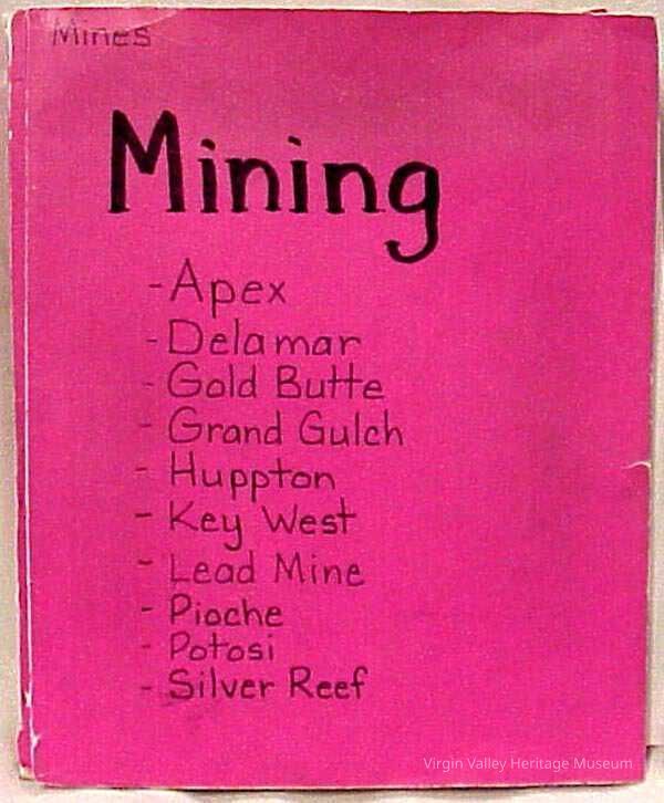 Mining in the mines at Apex, Delamar, Gold Butte, Huppton, Key West, Lead Mine, Pioche, Potosi, and Silver Reef. Collection of articles, photos and papers on different mines in the area.