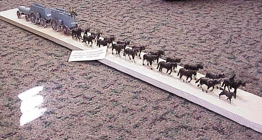 A model of the famous 20 Mule Borax Team that was made by Lamond Hughes when he was a teenager. These teams were run by the U.S. Borax company from 1883-1889. The teams were composed of eighteen mules and two horses and, with the help of a muleskinner (driver) would make trips delivering borax found in Death Valley to the railhead near Mojave. While the teams were only active for six years, they quickly become iconography for the Old West.