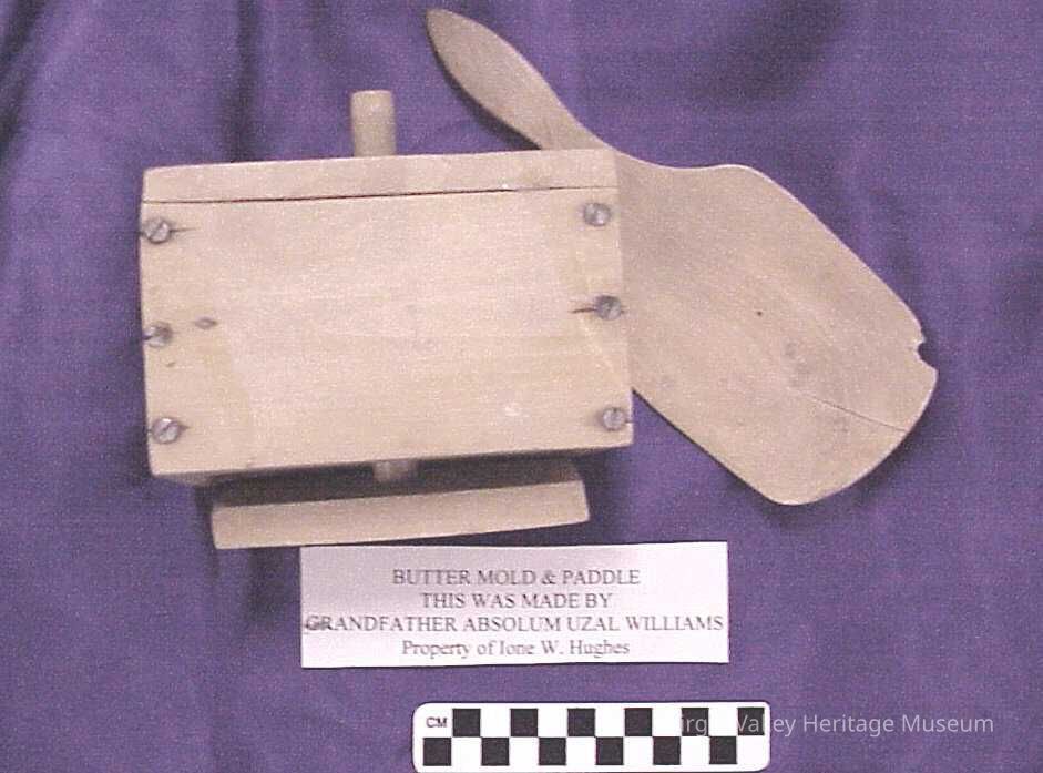 A butter mold and paddle handmade by Absolum Uzal Williams. Butter molds were used to shape butter and paddles were used to squeeze out any excess liquid within the butter as it was being churned.