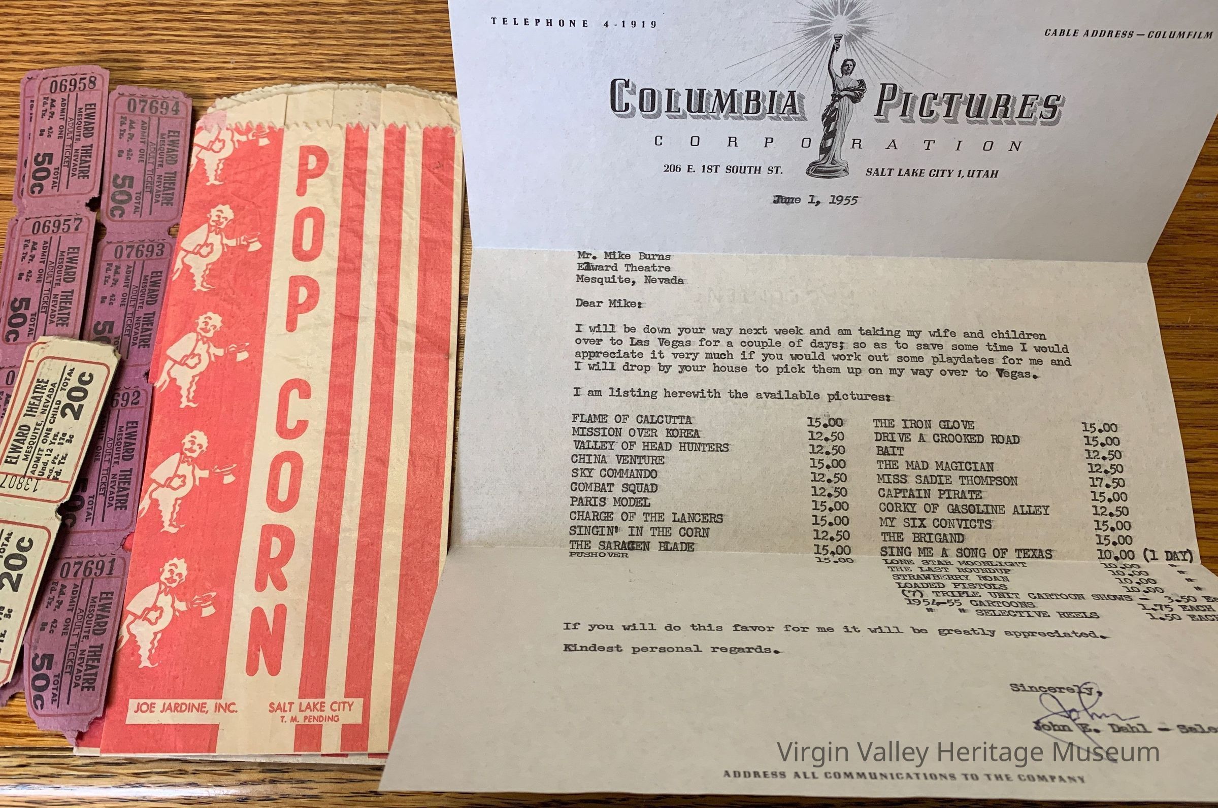 Elward Theater tickets, popcorn bags, and a letter from Columbia Records with a list of films.