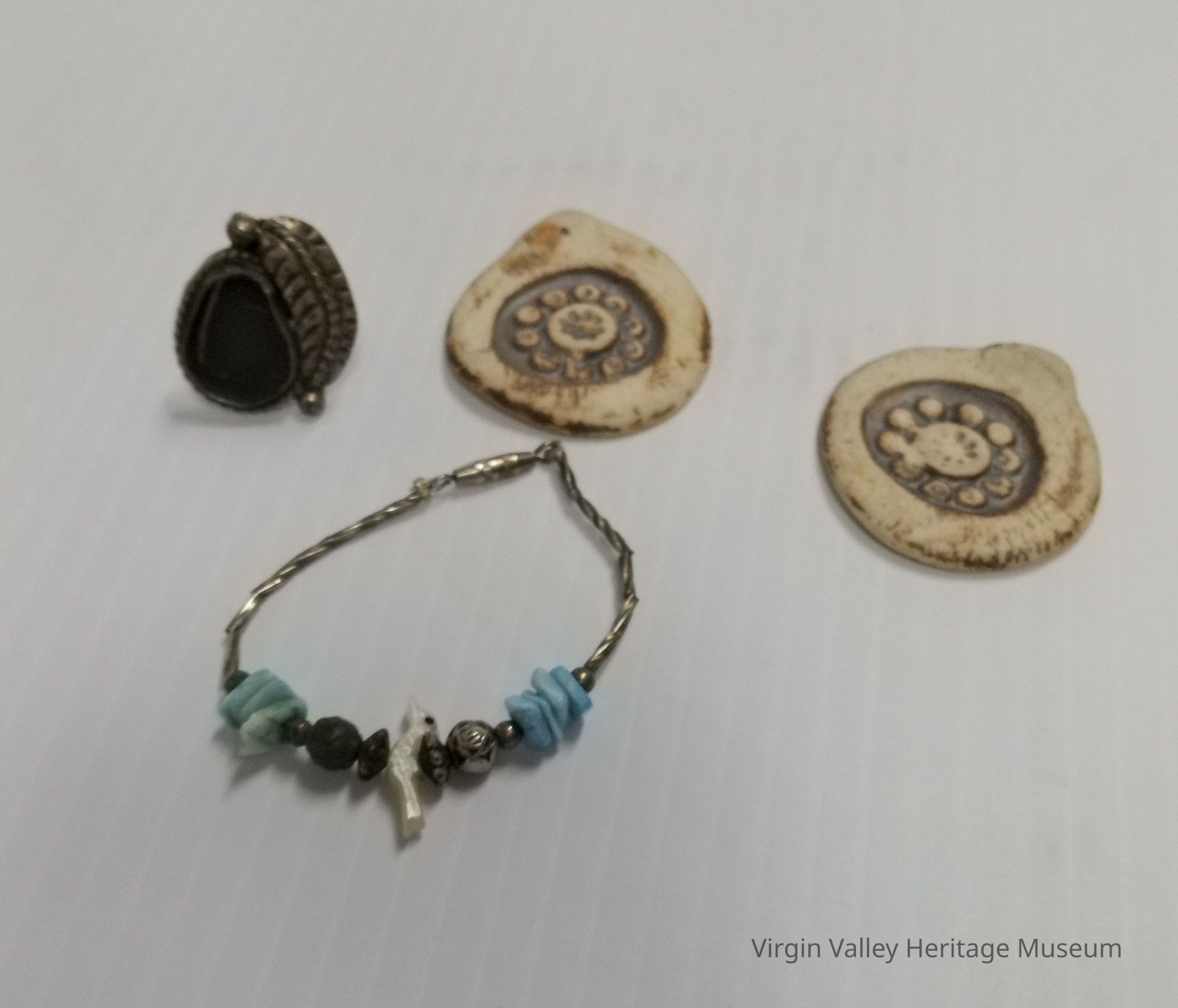 Baby bracelet made by the "Bird Lady" the bird is carved by hand. Ring missing stone (Navajo?) 2 clay earrings