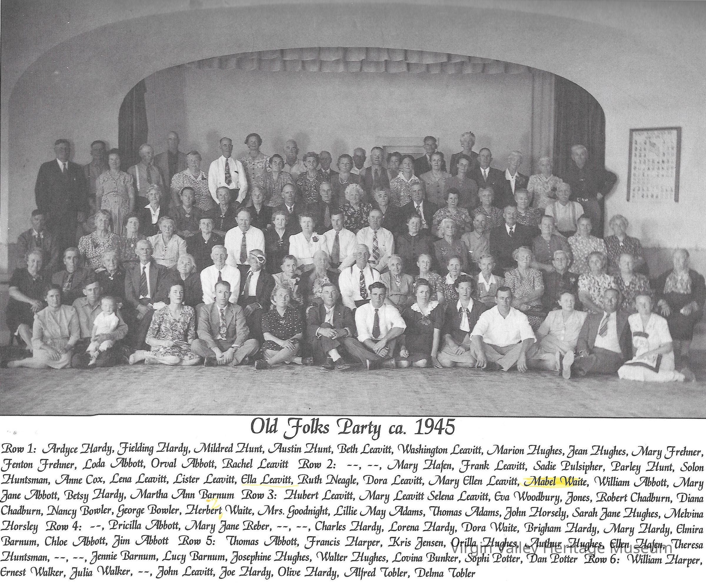 A picture from the Old Folks Party held in the Valley in 1945. It includes many Abbotts, Hughes, Hardys, Leavitts, Frehners, and Barnums, amongst others.