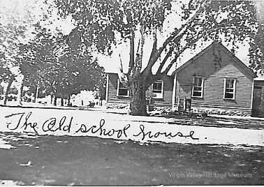 In 1899 a sawmill was set up on Blackrock Mountain and the lumber was hauled over the very rough, steep mountain roads down Elbow Canyon by pioneer wagons to Mesquite. There were no planing mills so the lumber was rough. Everyone helped with the building and a curtain was used as a partition for classes. As the floor of the native lumber would wear down and the knots, being harder, would be higher, the carpenters would take hand planes and smooth the knots down so it would be smooth for dancing. The only lighting was the kerosene lamps and the wax for the dance floor was from candles shaved and sprinkled on the floor.