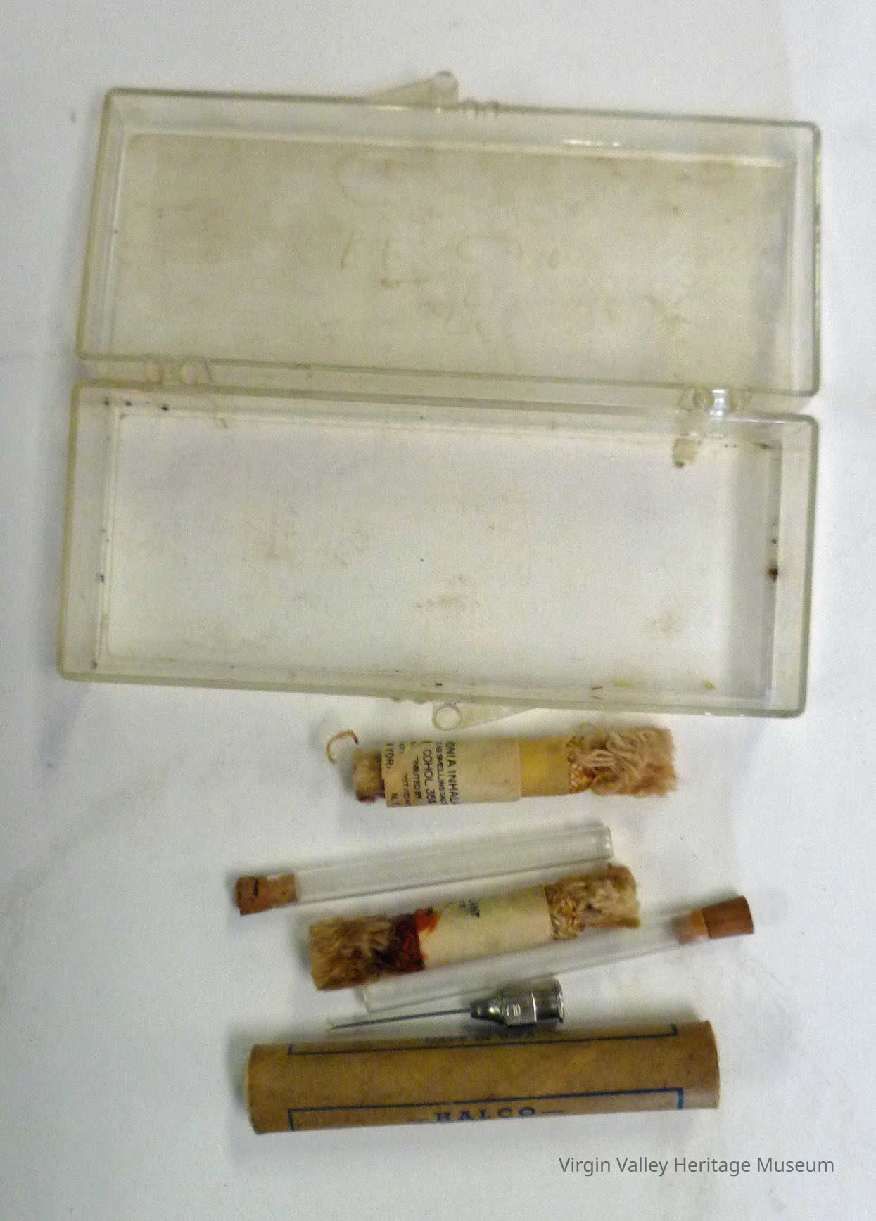 A small plastic box full of smelling salts from circa 1880s. One of the smelling salts is completely unbroken, while the other two have been used.