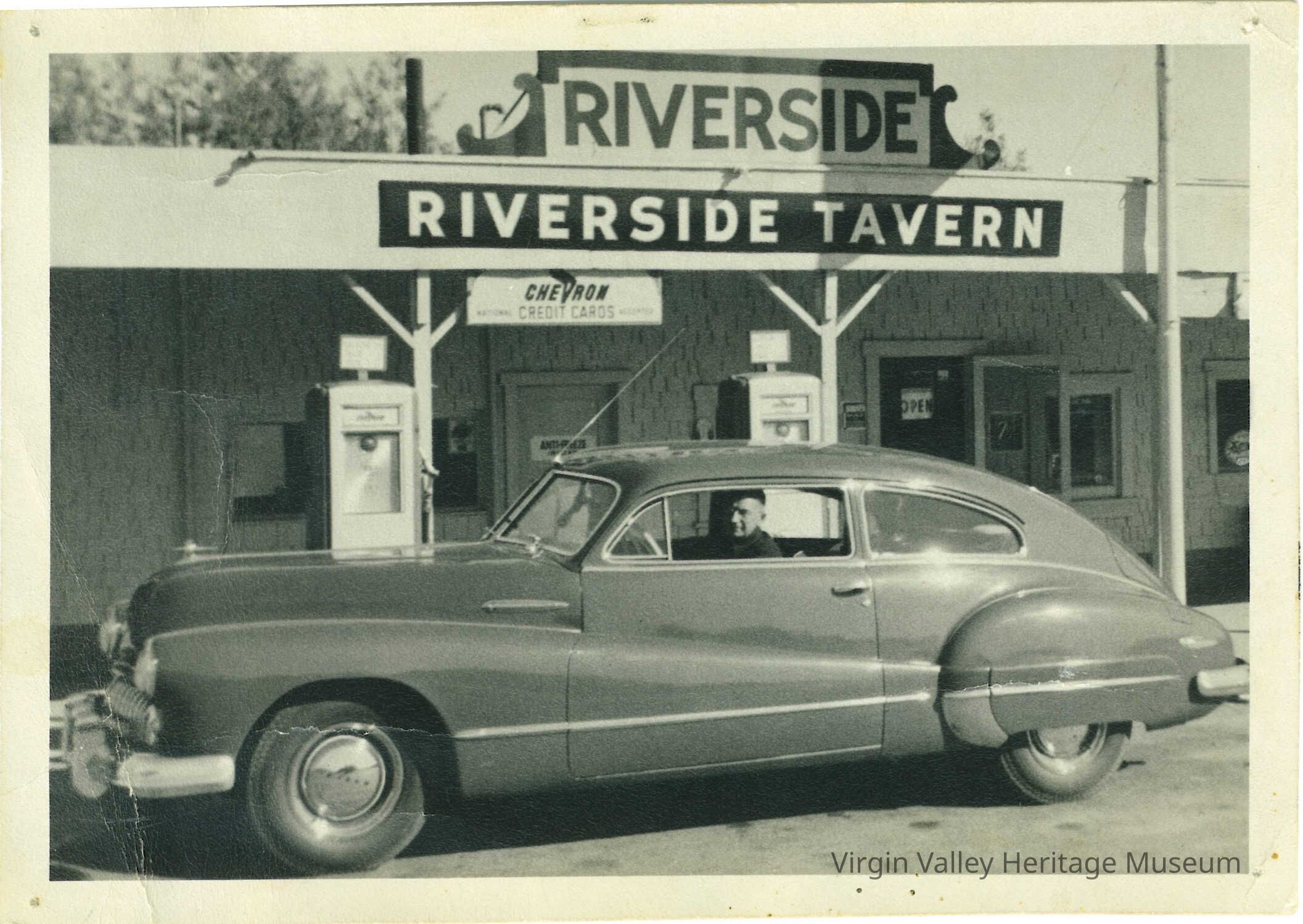 Photo in frame of a 1942-46 Buick in front of the Riverside Tavern, Bernie Sullivan at the wheel.