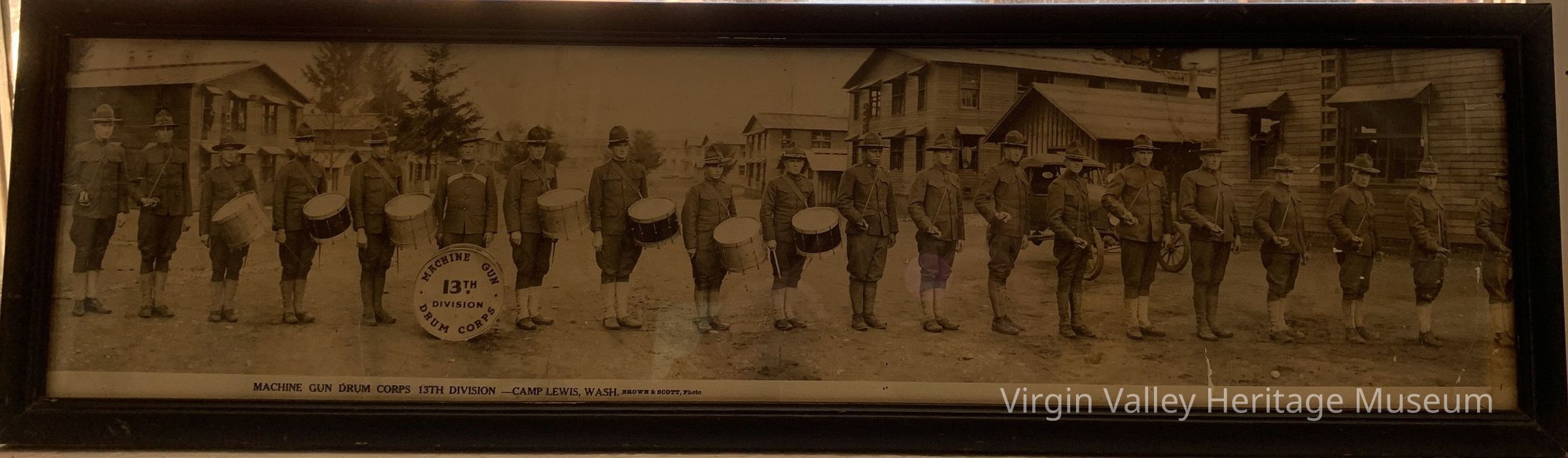 A picture of the machine gun drum corps 13th division at Camp Lewis, Washington during WWI. Ralph Huntsman is one of the men in the picture. Ralph first moved to Mesquite with his family when he was only four years old. In 1916, he was one of the members of the Virgin Valley High School basketball team that won the state basketball championship. He was called into the army on August 26, 1918 (his 22nd birthday), about two months before WWI ended.